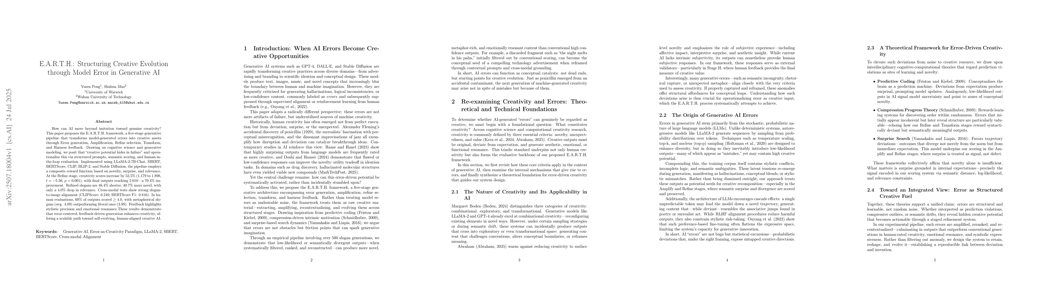 How can AI move beyond imitation toward genuine creativity? This paper proposes the E.A.R.T.H. framework, a five-stage generative pipeline that transforms model-generated errors into creative assets through Error generation, Amplification, Refine selection, Transform, and Harness feedback. Drawing on cognitive science and generative modeling, we posit that "creative potential hides in failure" and operationalize this via structured prompts, semantic scoring, and human-in-the-loop evaluation. Implemented using LLaMA-2-7B-Chat, SBERT, BERTScore, CLIP, BLIP-2, and Stable Diffusion, the pipeline employs a composite reward function based on novelty, surprise, and relevance. At the Refine stage, creativity scores increase by 52.5% (1.179 to 1.898, t = -5.56, p < 0.001), with final outputs reaching 2.010 - a 70.4% improvement. Refined slogans are 48.4% shorter, 40.7% more novel, with only a 4.0% drop in relevance. Cross-modal tests show strong slogan-to-image alignment (CLIPScore: 0.249; BERTScore F1: 0.816). In human evaluations, 60% of outputs scored >= 4.0, with metaphorical slogans (avg. 4.09) outperforming literal ones (3.99). Feedback highlights stylistic precision and emotional resonance. These results demonstrate that error-centered, feedback-driven generation enhances creativity, offering a scalable path toward self-evolving, human-aligned creative AI.