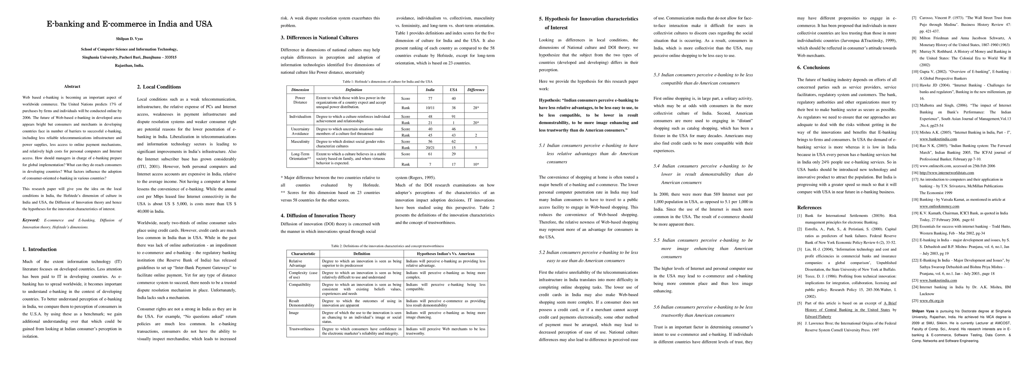 This paper explores the adoption of e-banking and e-commerce in India and the USA, focusing on barriers faced in developing countries and the factors influencing global implementation. It utilizes the Diffusion of Innovation theory and Hofstede's cultural dimensions to analyze local conditions and propose hypotheses for successful consumer-oriented e-banking adoption.