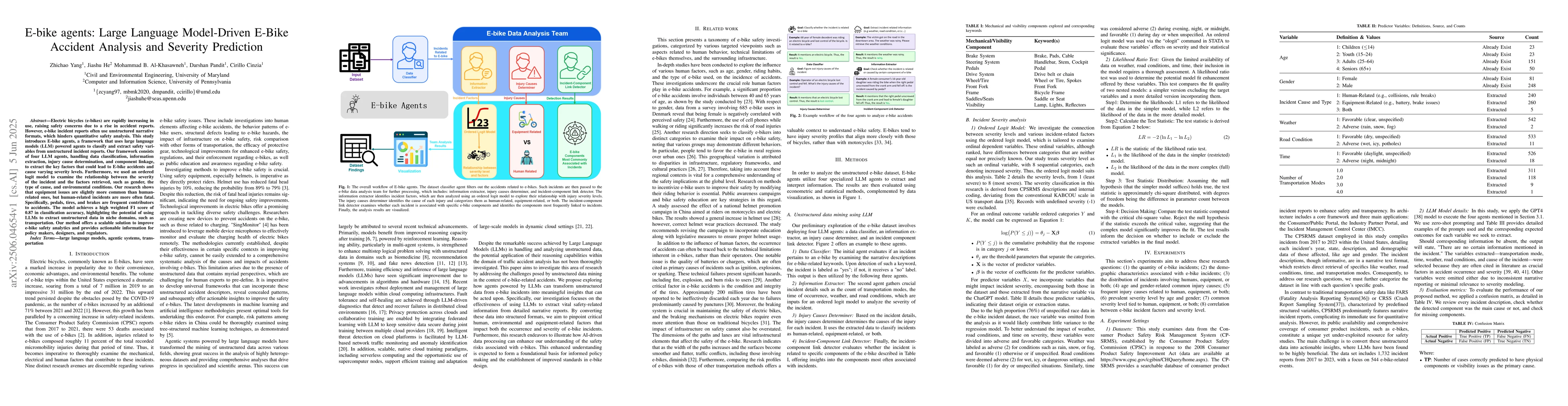 This study introduces E-bike agents, a framework using large language models to classify and extract safety variables from unstructured e-bike incident reports, revealing equipment issues as more common than human-related ones but fatal incidents often involving pedals, tires, and brakes.