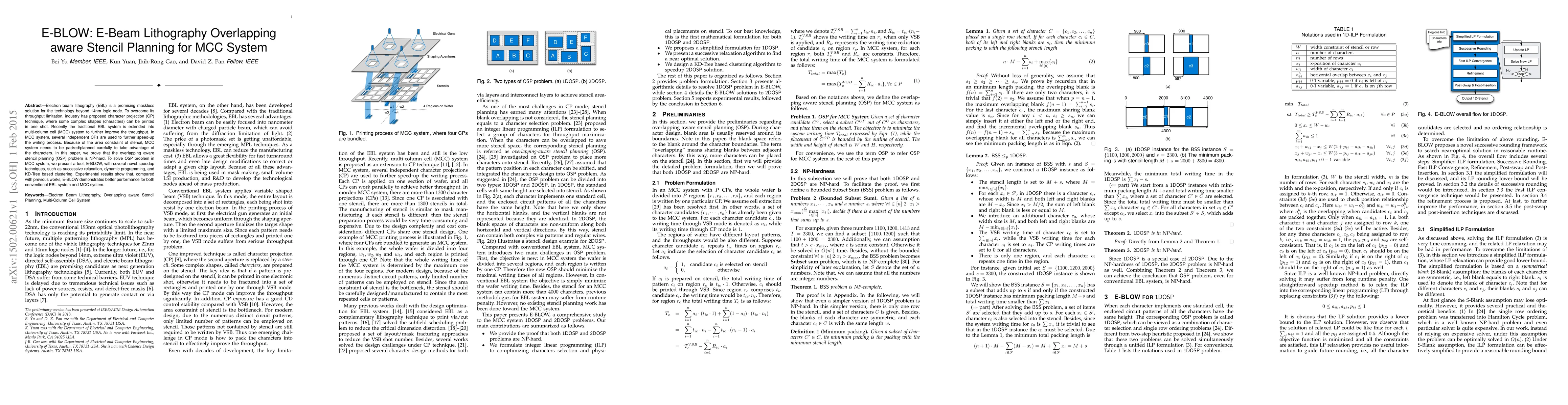 Electron beam lithography (EBL) is a promising maskless solution for the technology beyond 14nm logic node. To overcome its throughput limitation, industry has proposed character projection (CP) technique, where some complex shapes (characters) can be printed in one shot. Recently the traditional EBL system is extended into multi-column cell (MCC) system to further improve the throughput. In MCC system, several independent CPs are used to further speed-up the writing process. Because of the area constraint of stencil, MCC system needs to be packed/planned carefully to take advantage of the characters. In this paper, we prove that the overlapping aware stencil planning (OSP) problem is NP-hard. To solve OSP problem in MCC system, we present a tool, E-BLOW, with several novel speedup techniques, such as successive relaxation, dynamic programming, and KD-Tree based clustering. Experimental results show that, compared with previous works, E-BLOW demonstrates better performance for both conventional EBL system and MCC system.