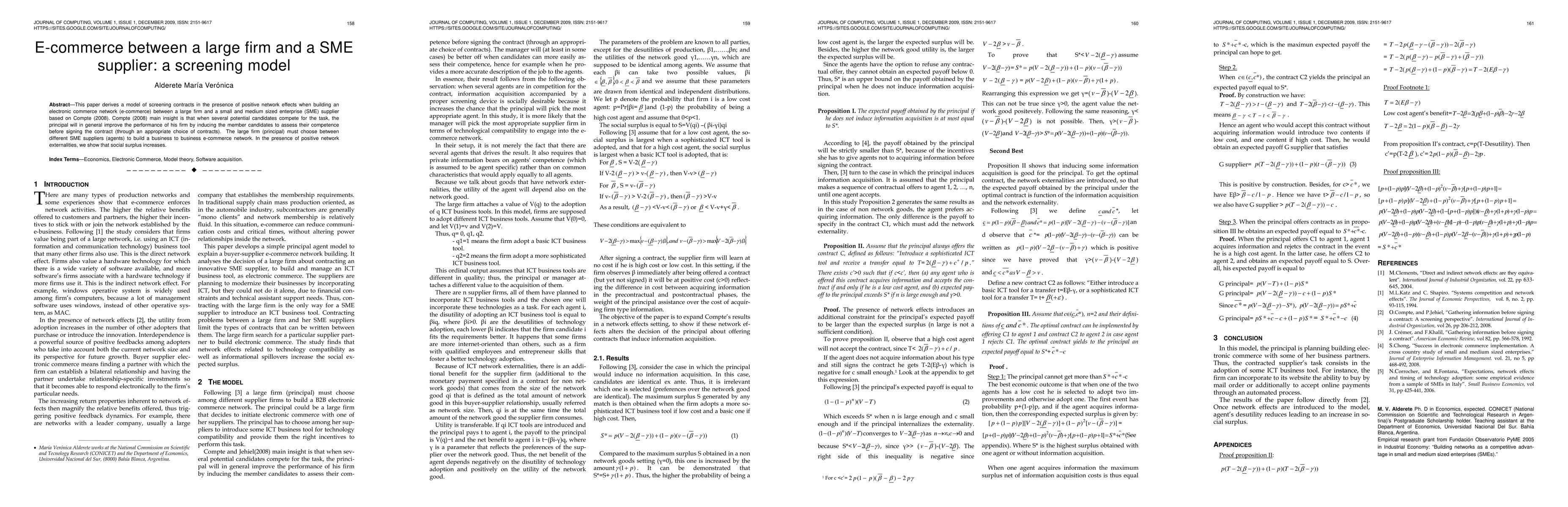 This paper develops a screening model for e-commerce contracts between a large firm and SME suppliers, highlighting how positive network effects can enhance social surplus when the principal selects the best SME based on competence assessments. The model demonstrates that appropriate contract choices can improve performance and increase overall social surplus.