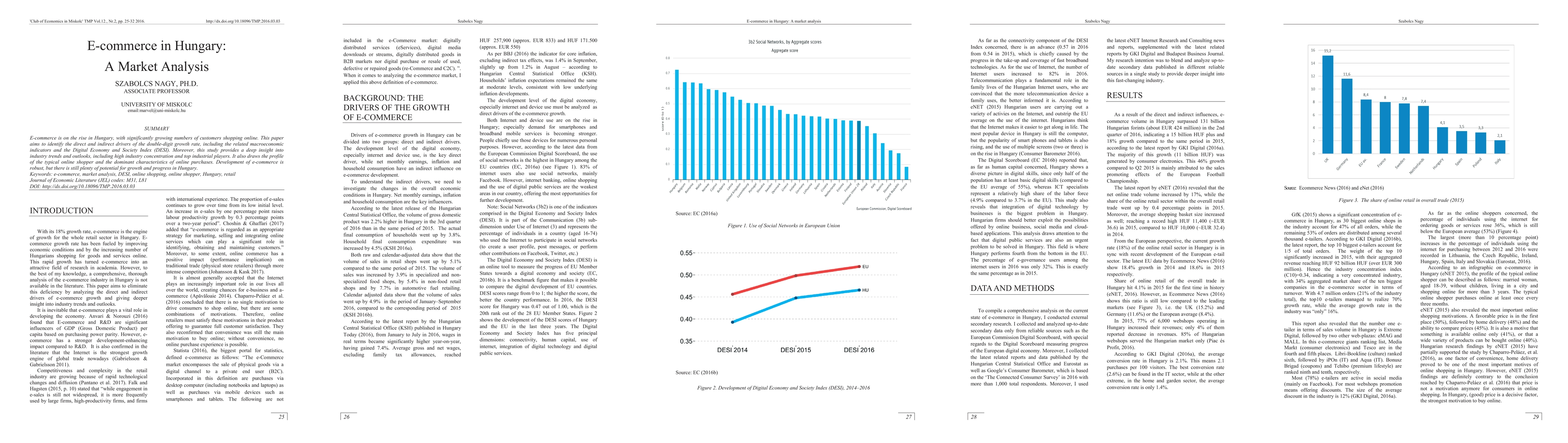 E-commerce is on the rise in Hungary, with significantly growing numbers of customers shopping online. This paper aims to identify the direct and indirect drivers of the double-digit growth rate, including the related macroeconomic indicators and the Digital Economy and Society Index (DESI). Moreover, this study provides a deep insight into industry trends and outlooks, including high industry concentration and top industrial players. It also draws the profile of the typical online shopper and the dominant characteristics of online purchases. Development of e-commerce is robust, but there is still plenty of potential for growth and progress in Hungary.