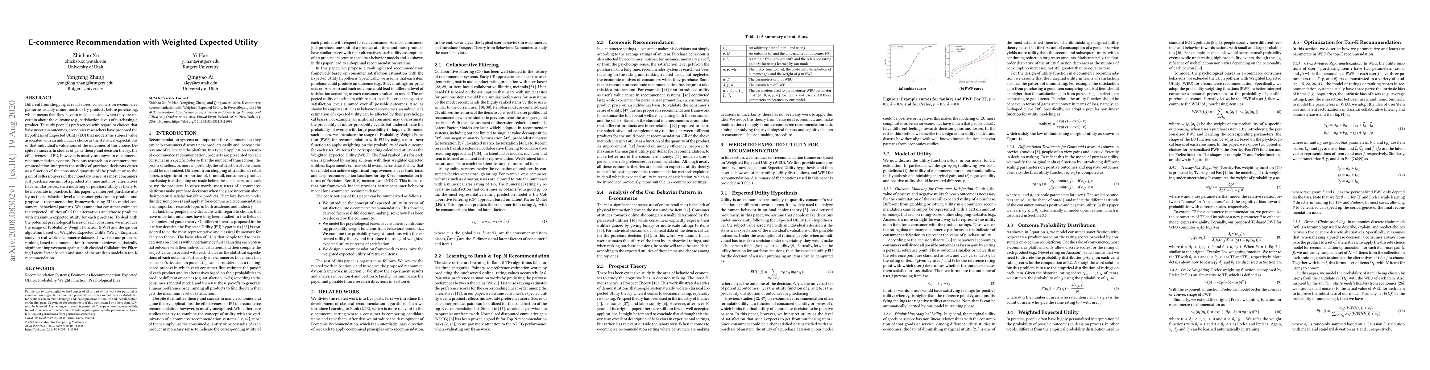 This paper proposes a recommendation framework for e-commerce using Weighted Expected Utility (WEU) to model consumer satisfaction and decision-making under uncertainty. It introduces a Probability Weight Function to address psychological biases, achieving significant improvements over traditional and deep learning recommendation models in empirical studies.