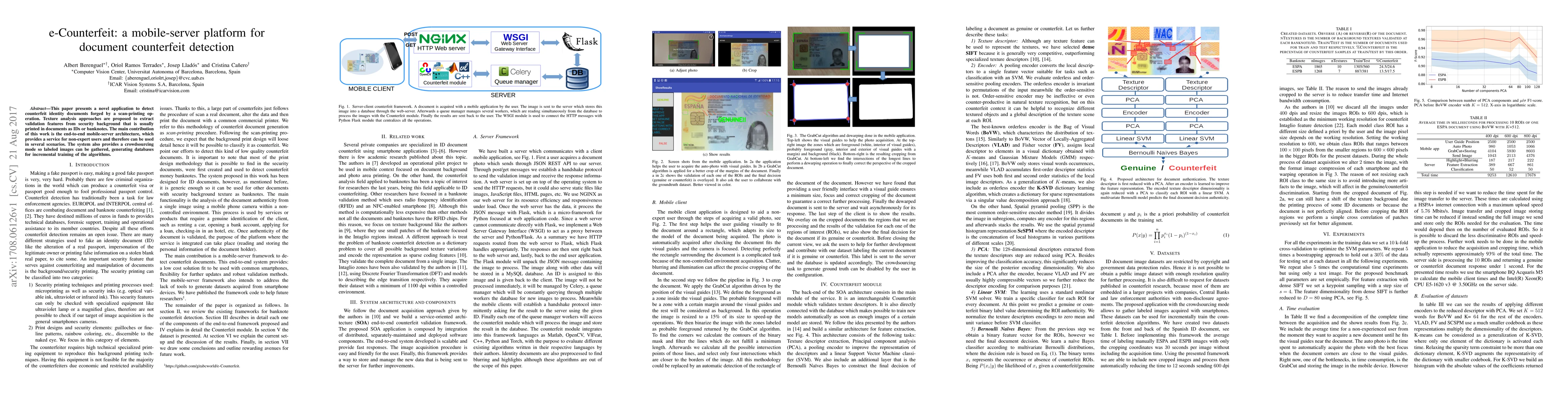 This paper introduces a mobile-server platform for detecting counterfeit identity documents using texture analysis to extract validation features from security backgrounds. The key innovation is its end-to-end architecture, enabling non-expert users and incorporating a crowdsourcing mode for database generation and algorithm training.