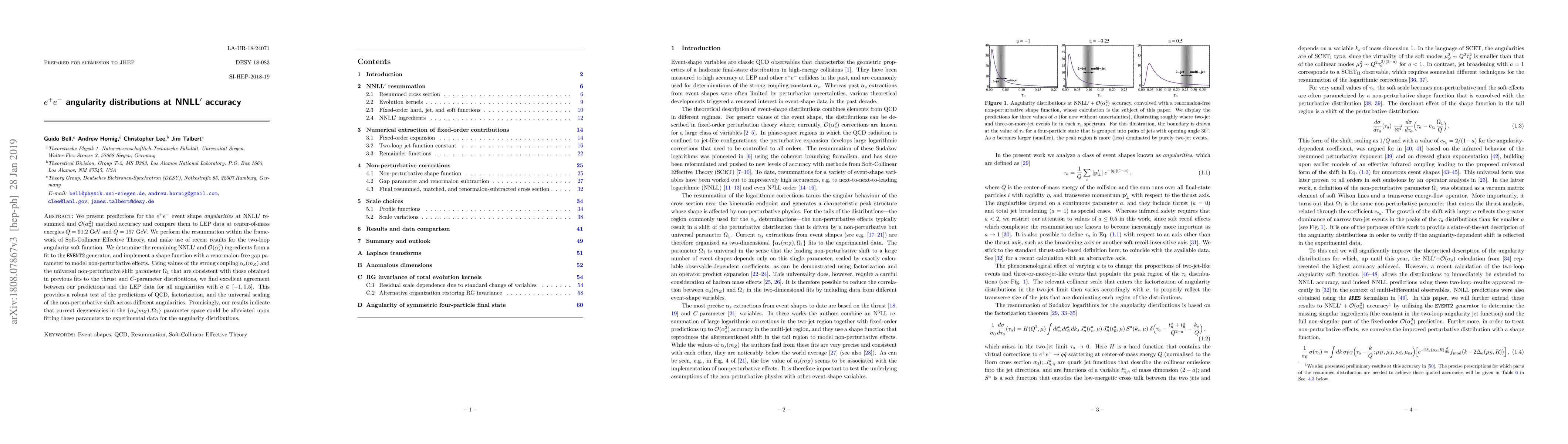 This paper predicts e+e- event shape angularity distributions at NNLL' accuracy, agreeing with LEP data for a wide range of angularities, providing a robust test of QCD predictions.