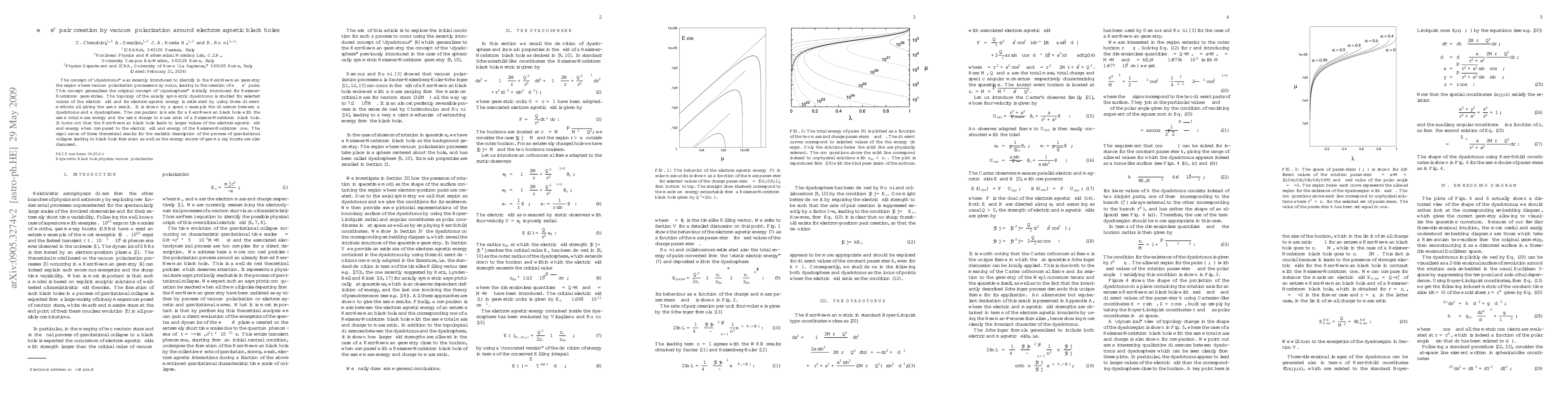 The concept of "dyadotorus" was recently introduced to identify in the Kerr-Newman geometry the region where vacuum polarization processes may occur, leading to the creation of $e^--e^+$ pairs. This concept generalizes the original concept of "dyadosphere" initially introduced for Reissner-Nordstr\"{o}m geometries. The topology of the axially symmetric dyadotorus is studied for selected values of the electric field and its electromagnetic energy is estimated by using three different methods all giving the same result. It is shown by a specific example the difference between a dyadotorus and a dyadosphere. The comparison is made for a Kerr-Newman black hole with the same total mass energy and the same charge to mass ratio of a Reissner-Nordstr\"{o}m black hole. It turns out that the Kerr-Newman black hole leads to larger values of the electromagnetic field and energy when compared to the electric field and energy of the Reissner-Nordstr\"{o}m one. The significance of these theoretical results for the realistic description of the process of gravitational collapse leading to black hole formation as well as the energy source of gamma ray bursts are also discussed.