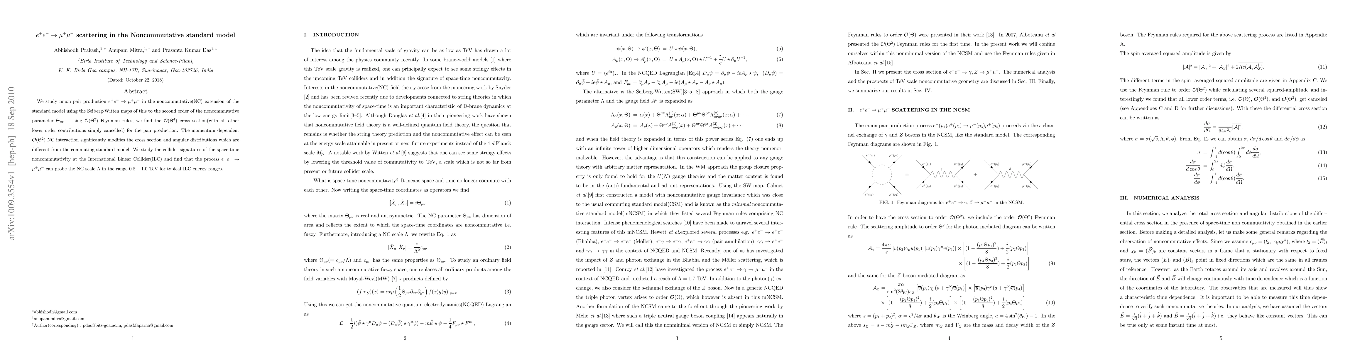 We study muon pair production $ e^+ e^- \to \mu^+ \mu^-$ in the noncommutative(NC) extension of the standard model using the Seiberg-Witten maps of this to the second order of the noncommutative parameter $\Theta_{\mu \nu}$. Using $\mathcal{O}(\Theta^2)$ Feynman rules, we find the $\mathcal{O}(\Theta^4)$ cross section(with all other lower order contributions simply cancelled) for the pair production. The momentum dependent $\mathcal{O}(\Theta^2)$ NC interaction significantly modifies the cross section and angular distributions which are different from the commuting standard model. We study the collider signatures of the space-time noncommutativity at the International Linear Collider(ILC) and find that the process $ e^+ e^- \to \mu^+ \mu^-$ can probe the NC scale $\Lambda$ in the range $0.8 - 1.0$ TeV for typical ILC energy ranges.