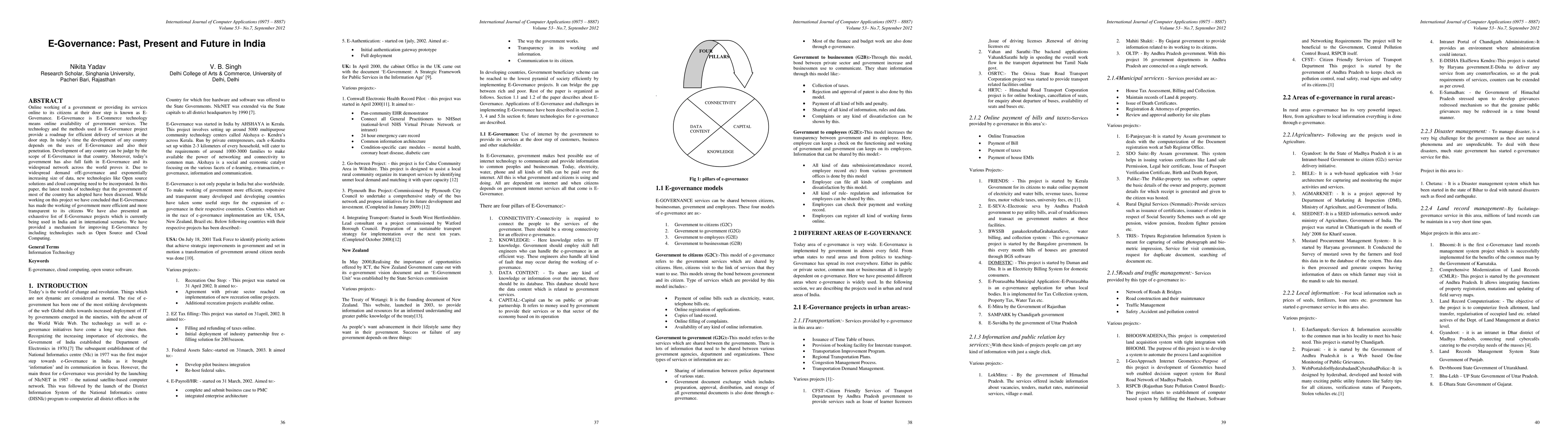 This paper reviews the evolution of E-Governance in India, highlighting its increased efficiency and transparency. It discusses current trends and technologies, including open source solutions and cloud computing, and presents a comprehensive list of E-Governance projects in use, along with recommendations for further improvements.