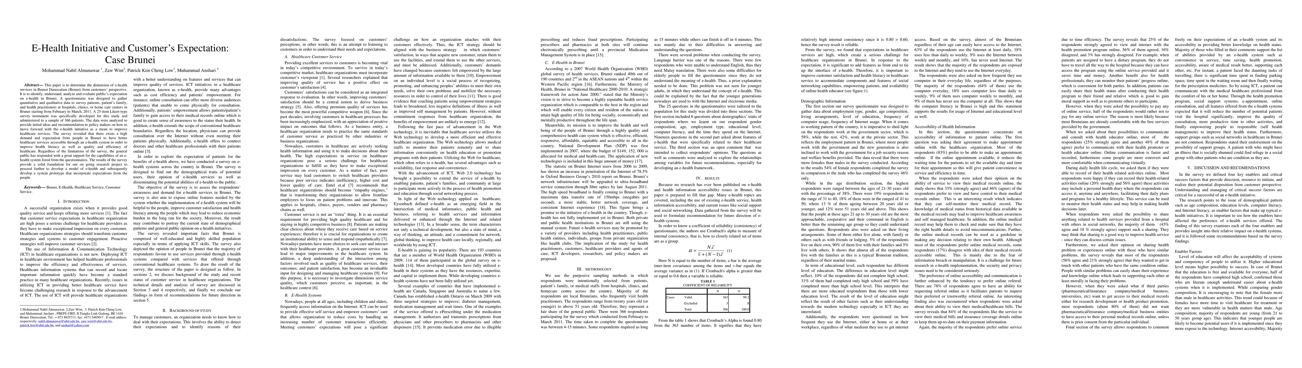 This study assesses public expectations regarding e-health services in Brunei Darussalam, revealing high demand for improved healthcare accessibility and quality through an e-health system. The survey results support the development of an e-health model and prototype based on public input.