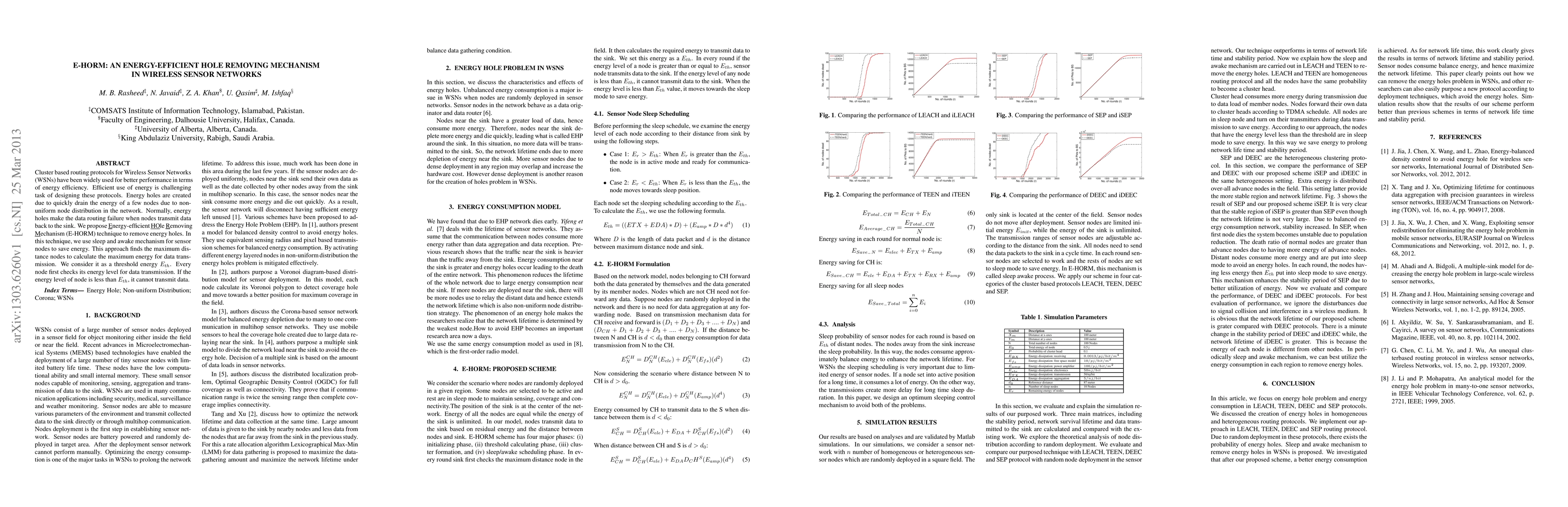 Title: E-HORM: An Energy-efficient Hole Removing Mechanism in Wireless Sensor Networks Summary: E-HORM proposes an energy-efficient technique to mitigate energy holes in WSNs, using a sleep and awake mechanism for nodes, and a threshold energy level to ensure optimal data transmission and energy conservation.