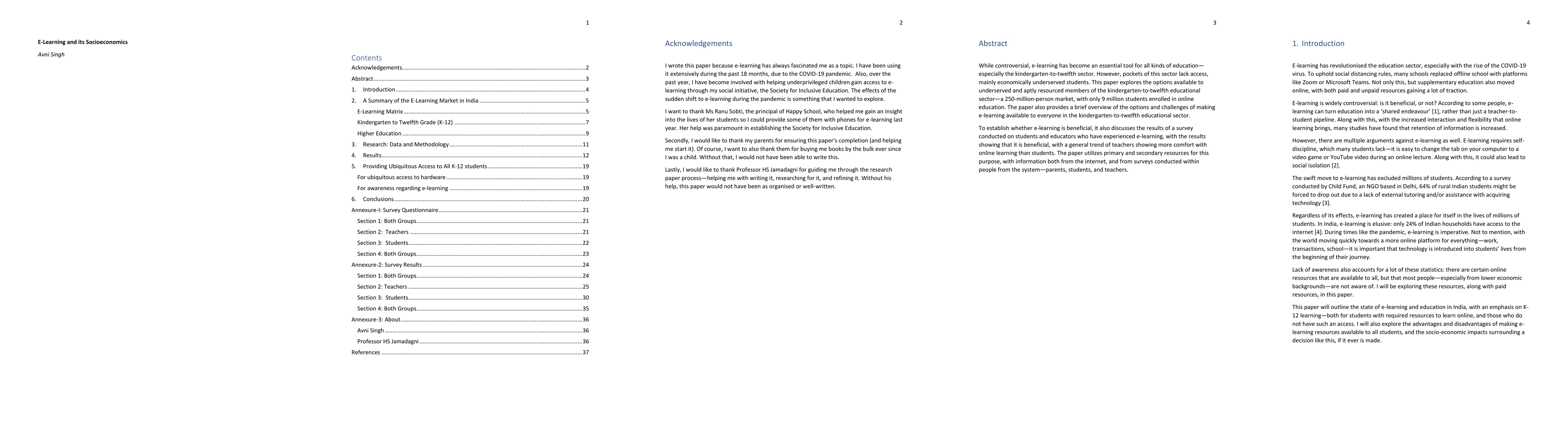 This paper examines e-learning in kindergarten-to-twelfth education, highlighting a significant access gap for economically underserved students. Despite only 9 million out of 25 million eligible students utilizing online education, surveys suggest e-learning benefits both teachers and students, with teachers showing greater comfort. The research combines internet data with surveys from parents, students, and teachers to discuss solutions for broader e-learning accessibility.