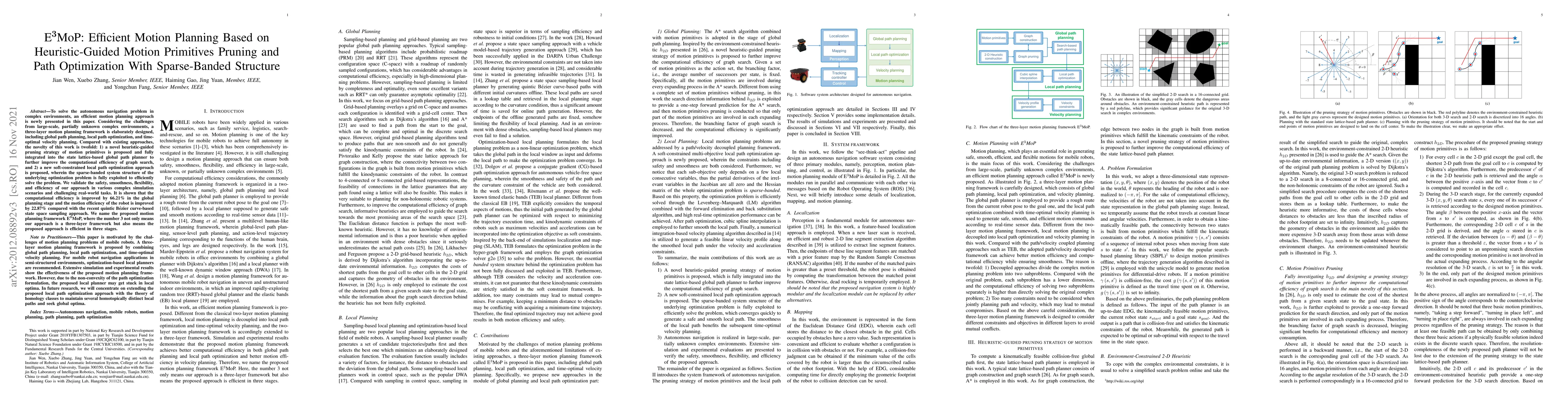 The paper introduces E$ \mathbf{^3} $MoP, a three-layer motion planning framework for autonomous navigation in complex environments, featuring heuristic-guided motion primitives pruning and path optimization leveraging sparse-banded structures. The approach improves computational efficiency by 66.21% in global planning and enhances robot motion efficiency by 22.87% compared to existing methods.