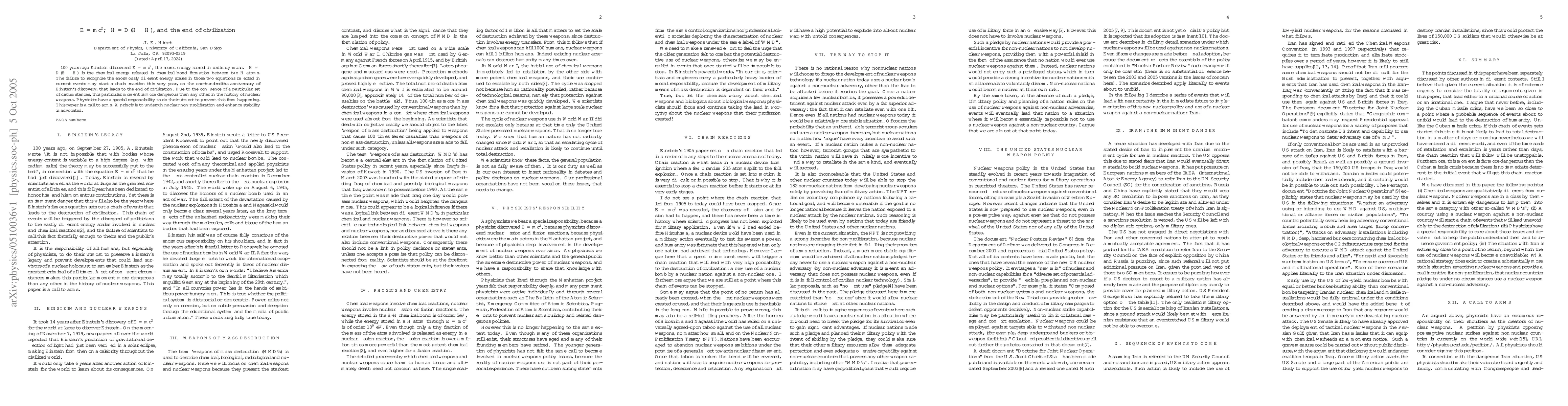 100 years ago Einstein discovered $E=mc^2$, the secret energy stored in ordinary mass. $\Delta H = D(H-H)$ is the chemical energy released in chemical bond formation between two H atoms. The failure to recognize the enormously different energy scales in those two equations reflected in current events may start a chain reaction this very year, on the one-hundredths anniversary of Einstein's discovery, that leads to the end of civilization. Due to the confluence of a particular set of circumstances, this particular moment is more dangerous than any other in the history of nuclear weapons. Physicists have a special responsibility to do their utmost to prevent this from happening. This paper is a call to arms. A principle to underpin nuclear non-proliferation and enhance stability is advocated.
