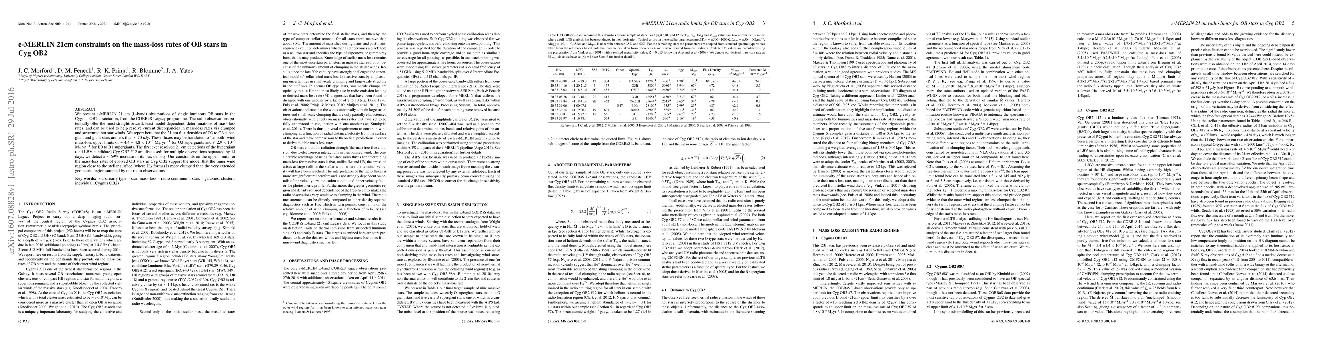 This study uses e-MERLIN 21 cm observations to determine mass-loss rates for OB stars in Cyg OB2, finding upper limits of ~4.4-4.8 x 10^(-6) M_sol/yr for O3 supergiants and < 2.9 x 10^(-6) M_sol/yr for B0 to B1 supergiants, supporting the idea that inner wind regions are more clumped than extended regions.