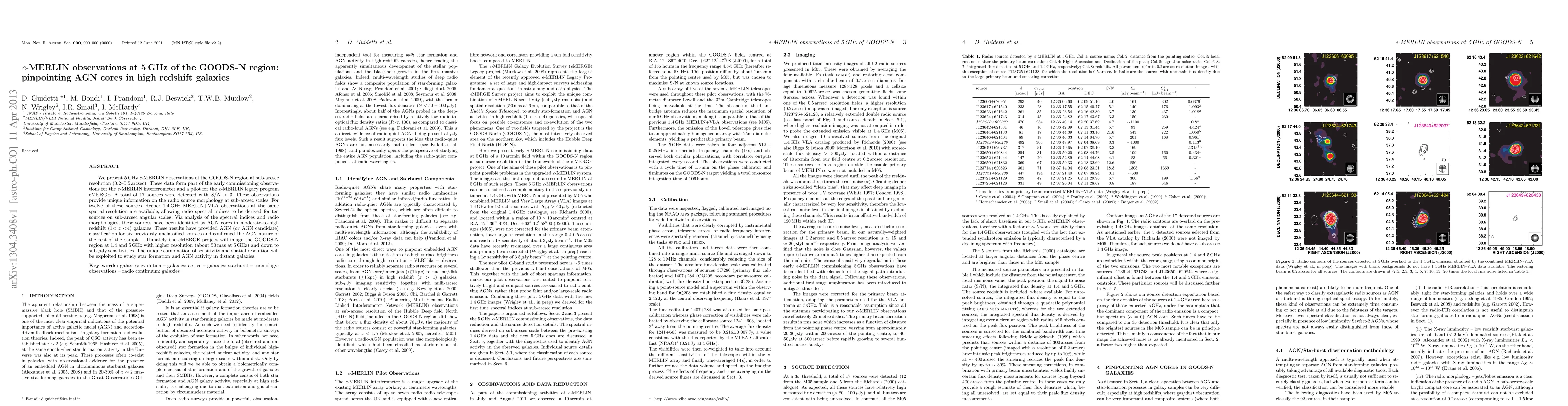 This study uses 5 GHz e-MERLIN observations to identify AGN cores in high-redshift galaxies within the GOODS-N region, achieving sub-arcsec resolution. The analysis of radio spectral indices and morphologies confirms the AGN nature of most sources, classifying six previously unclassified ones.