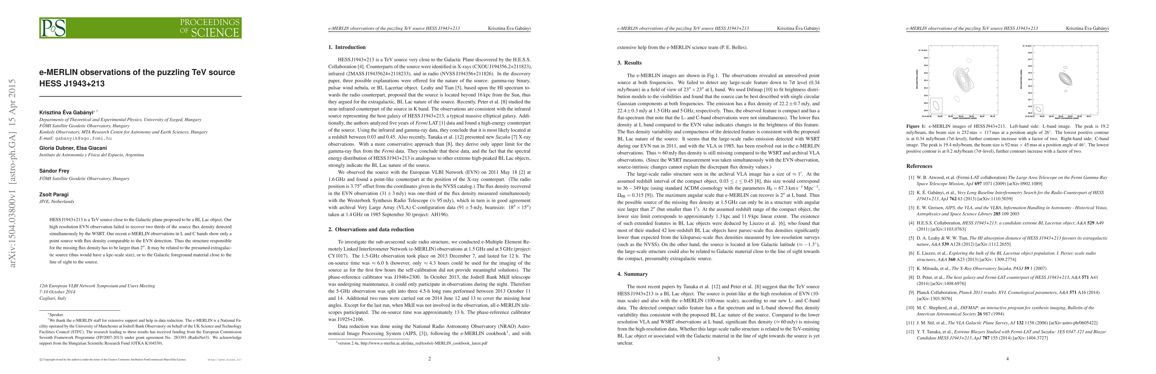 HESS J1943+213 is a TeV source close to the Galactic plane proposed to be a BL Lac object. Our high resolution EVN observation failed to recover two thirds of the source flux density detected simultaneously by the WSRT. Our recent e-MERLIN observations in L and C bands show only a point source with flux density comparable to the EVN detection. Thus the structure responsible for the missing flux density has to be larger than 2". It may be related to the presumed extragalactic source (thus would have a kpc-scale size), or to the Galactic foreground material close to the line of sight to the source.