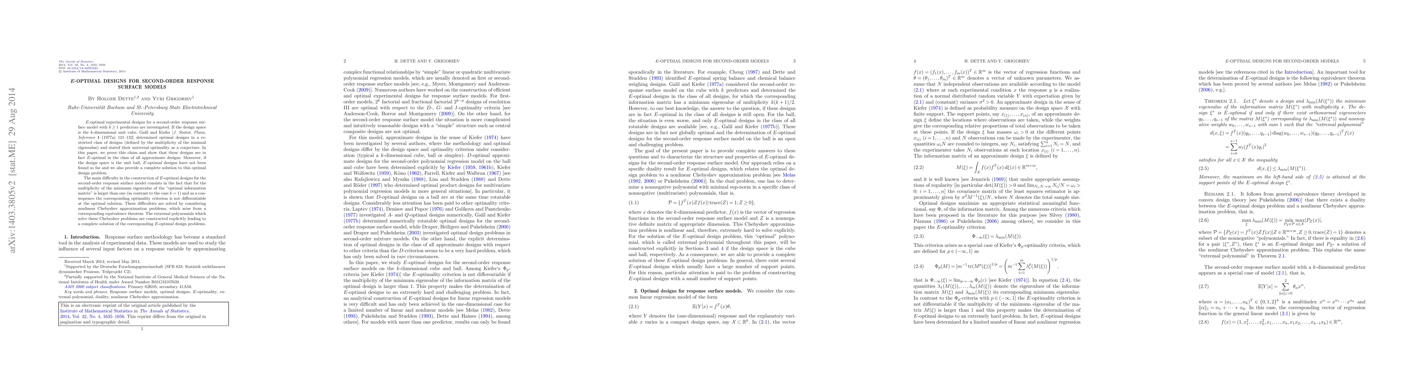 This paper proves the conjecture by Galil and Kiefer regarding $E$-optimal designs for second-order response surface models within the $k$-dimensional unit cube, showing their optimality across all approximate designs. It also provides a complete solution for $E$-optimal designs within the unit ball, addressing the non-differentiability issue through nonlinear Chebyshev approximation problems.