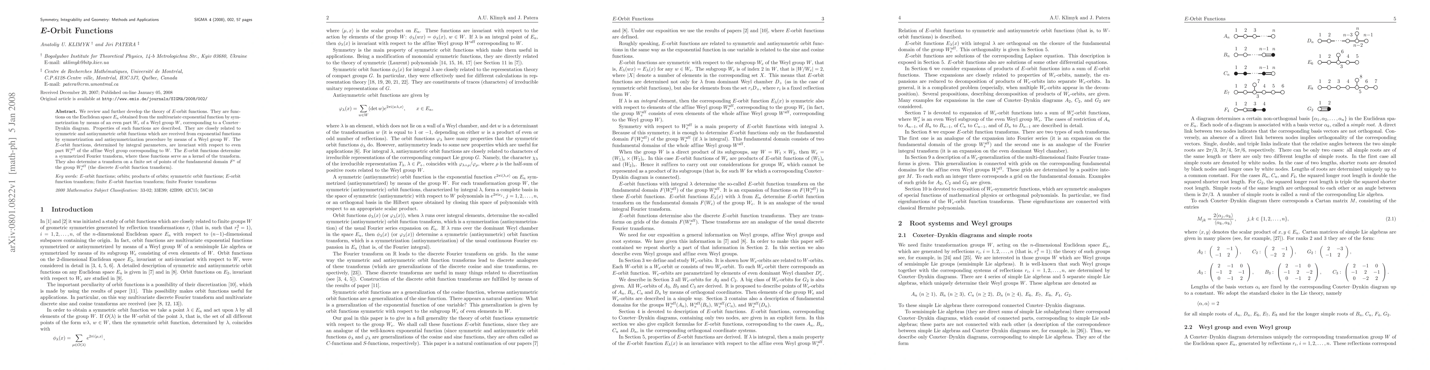 We review and further develop the theory of $E$-orbit functions. They are functions on the Euclidean space $E_n$ obtained from the multivariate exponential function by symmetrization by means of an even part $W_{e}$ of a Weyl group $W$, corresponding to a Coxeter-Dynkin diagram. Properties of such functions are described. They are closely related to symmetric and antisymmetric orbit functions which are received from exponential functions by symmetrization and antisymmetrization procedure by means of a Weyl group $W$. The $E$-orbit functions, determined by integral parameters, are invariant with respect to even part $W^{\rm aff}_{e}$ of the affine Weyl group corresponding to $W$. The $E$-orbit functions determine a symmetrized Fourier transform, where these functions serve as a kernel of the transform. They also determine a transform on a finite set of points of the fundamental domain $F^{e}$ of the group $W^{\rm aff}_{e}$ (the discrete $E$-orbit function transform).