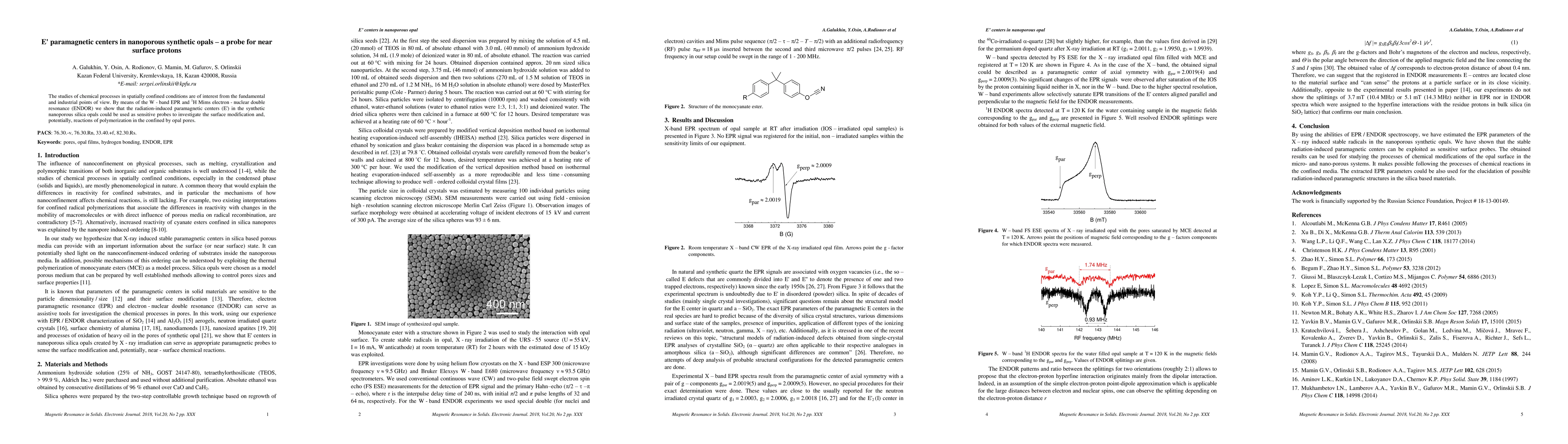 This study utilizes W band EPR and 1H Mims ENDOR to demonstrate that radiation-induced E' paramagnetic centers in synthetic nanoporous silica opals can serve as sensitive probes for investigating near-surface proton interactions and potential polymerization reactions within confined spaces.