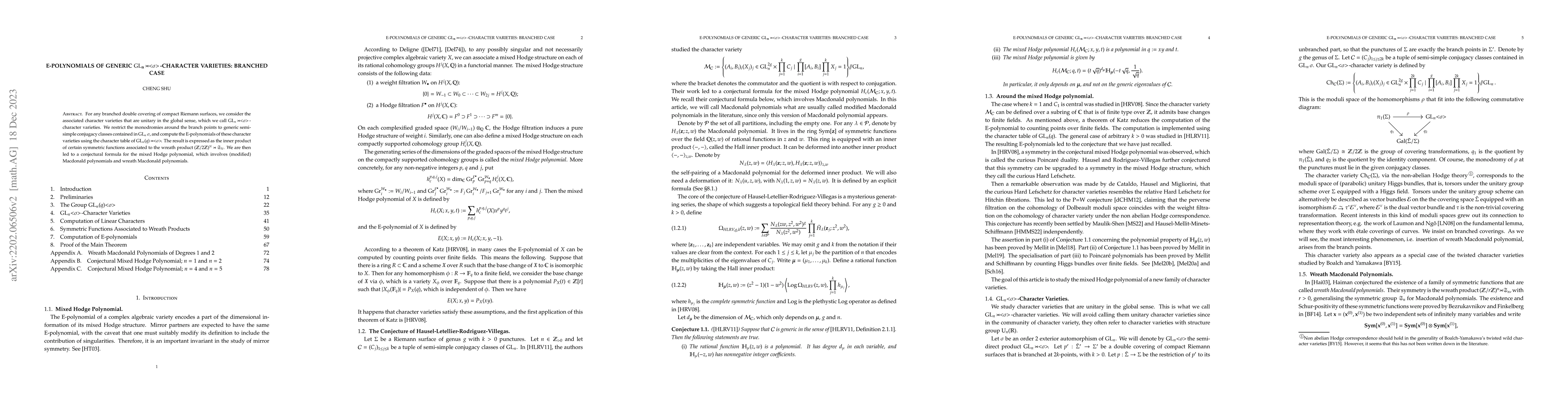 For any branched double covering of compact Riemann surfaces, we consider the associated character varieties that are unitary in the global sense, which we call $\text{GL}_n\rtimes\!<\!\sigma\!>\!~$-character varieties. We restrict the monodromies around the ramification points to generic semi-simple conjugacy classes contained in $\text{GL}_n\sigma$, and compute the E-polynomials of these character varieties using the character table of $\text{GL}_n(q)\rtimes\!<\!\sigma\!>\!$. The result is expressed as the inner product of certain symmetric functions associated to the wreath products $(\mathbb{Z}/2\mathbb{Z})^N\rtimes\mathfrak{S}_N$. We are then led to a conjectural formula for the mixed Hodge polynomial, which involves (modified) Macdonald polynomials and wreath Macdonald polynomials.