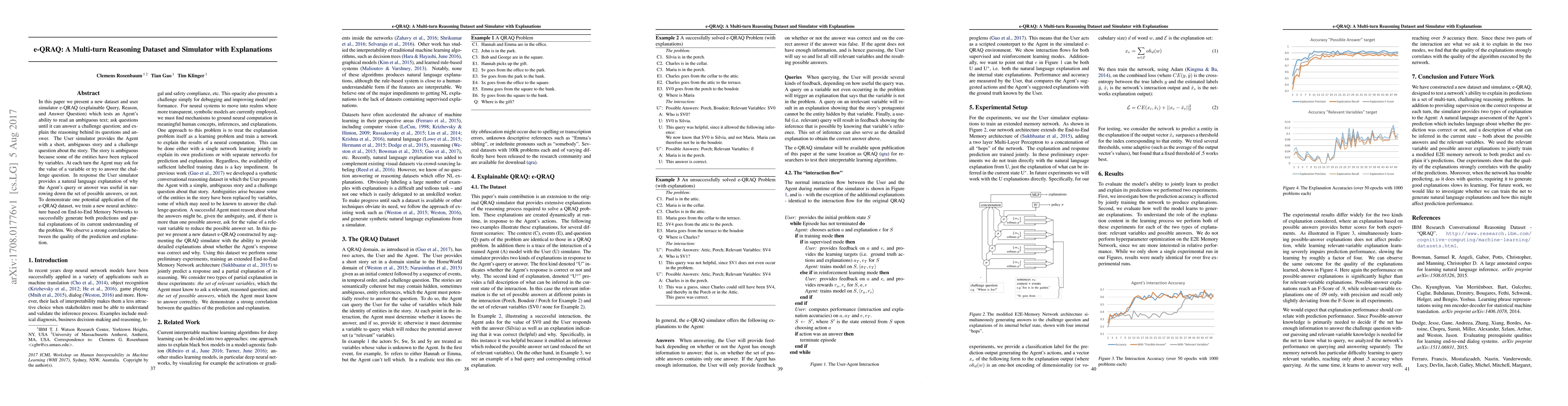 In this paper we present a new dataset and user simulator e-QRAQ (explainable Query, Reason, and Answer Question) which tests an Agent's ability to read an ambiguous text; ask questions until it can answer a challenge question; and explain the reasoning behind its questions and answer. The User simulator provides the Agent with a short, ambiguous story and a challenge question about the story. The story is ambiguous because some of the entities have been replaced by variables. At each turn the Agent may ask for the value of a variable or try to answer the challenge question. In response the User simulator provides a natural language explanation of why the Agent's query or answer was useful in narrowing down the set of possible answers, or not. To demonstrate one potential application of the e-QRAQ dataset, we train a new neural architecture based on End-to-End Memory Networks to successfully generate both predictions and partial explanations of its current understanding of the problem. We observe a strong correlation between the quality of the prediction and explanation.