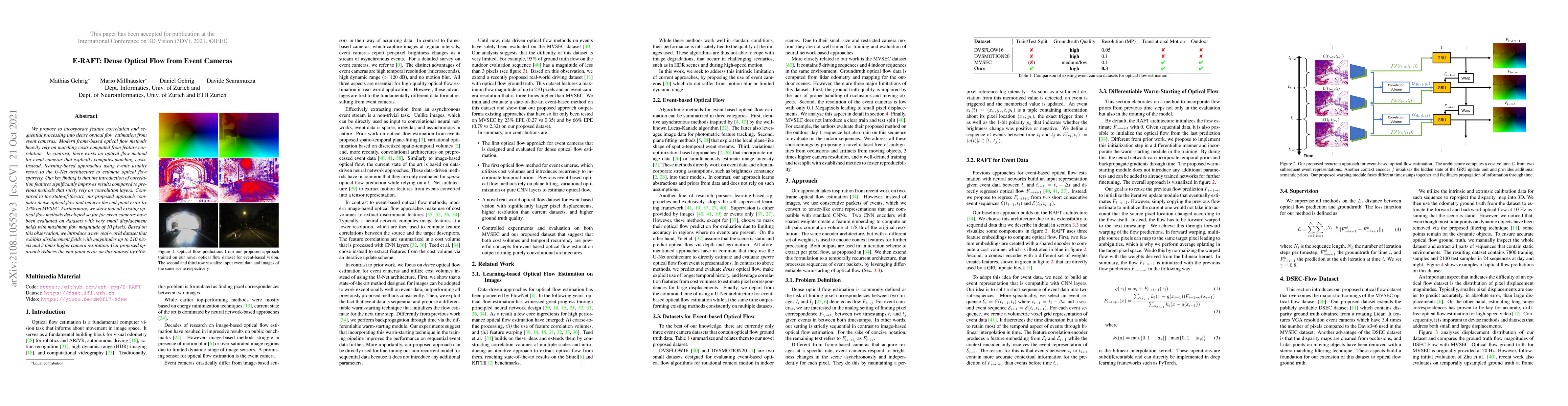 The paper introduces E-RAFT, a method for dense optical flow estimation from event cameras that leverages feature correlation and sequential processing, significantly improving accuracy over previous sparse estimation methods. The approach reduces end-point error by 23% on MVSEC and 66% on a newly introduced dataset with larger displacement fields.