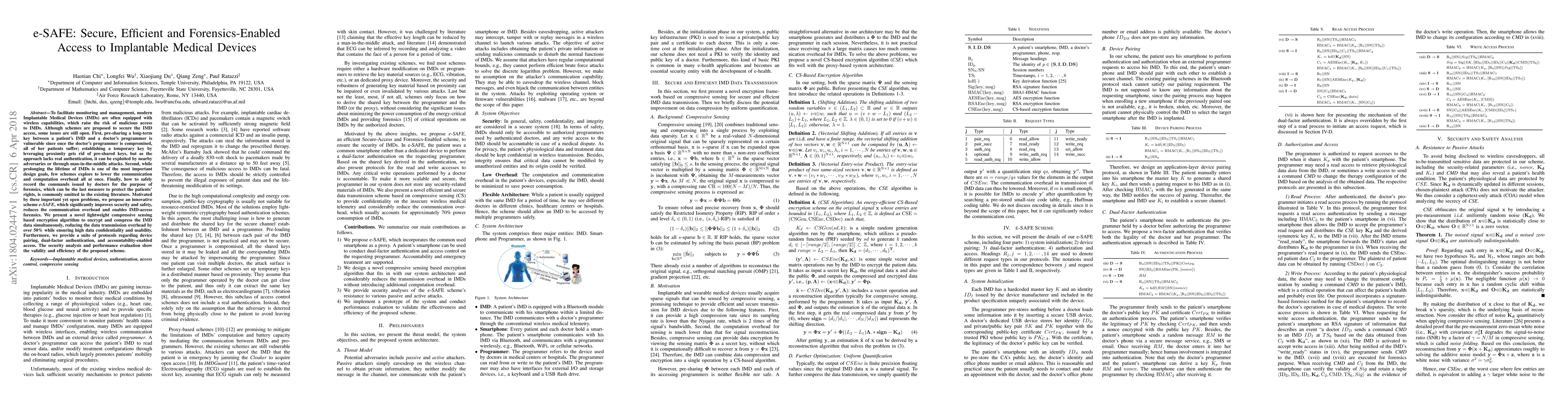 The paper proposes e-SAFE, a secure, efficient, and forensics-enabled access scheme for Implantable Medical Devices (IMDs), addressing vulnerabilities in existing access methods, reducing communication overhead, and enabling forensic recording of commands for patient protection. The scheme employs a lightweight compressive sensing encryption algorithm and a protocol suite for secure device pairing and dual-factor authentication.