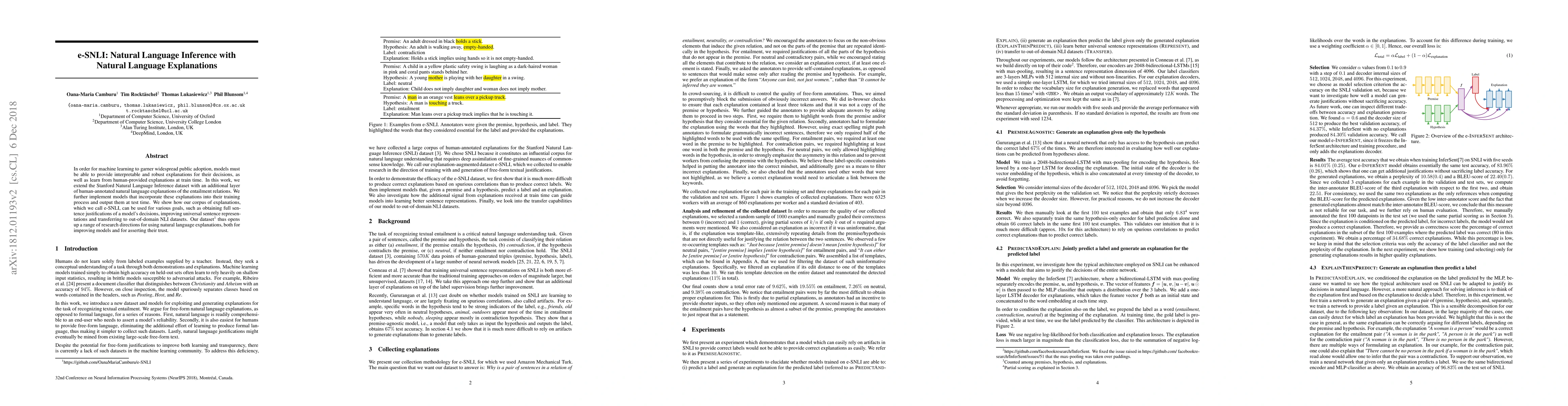 The paper introduces e-SNLI, an extension of SNLI enriched with human-annotated natural language explanations for entailment relations. The study explores models trained with these explanations to improve interpretability and transferability, highlighting the dataset's potential for enhancing model trust and performance.