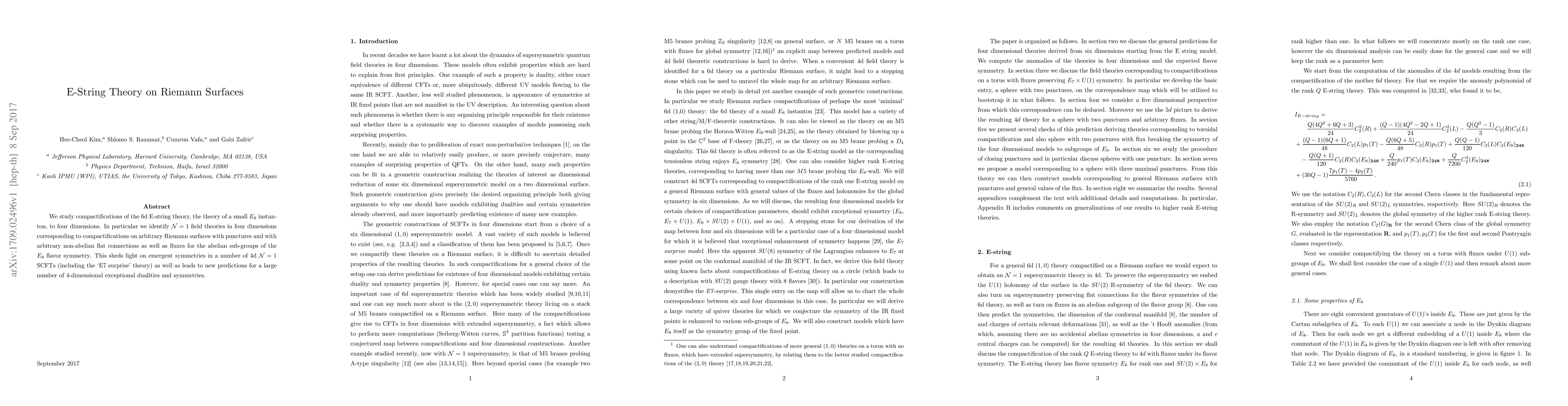 This paper explores the compactification of 6d E-string theory to four dimensions, identifying N=1 field theories on Riemann surfaces with punctures and non-abelian flat connections. It reveals emergent symmetries in various 4d N=1 SCFTs and predicts new dualities and symmetries.