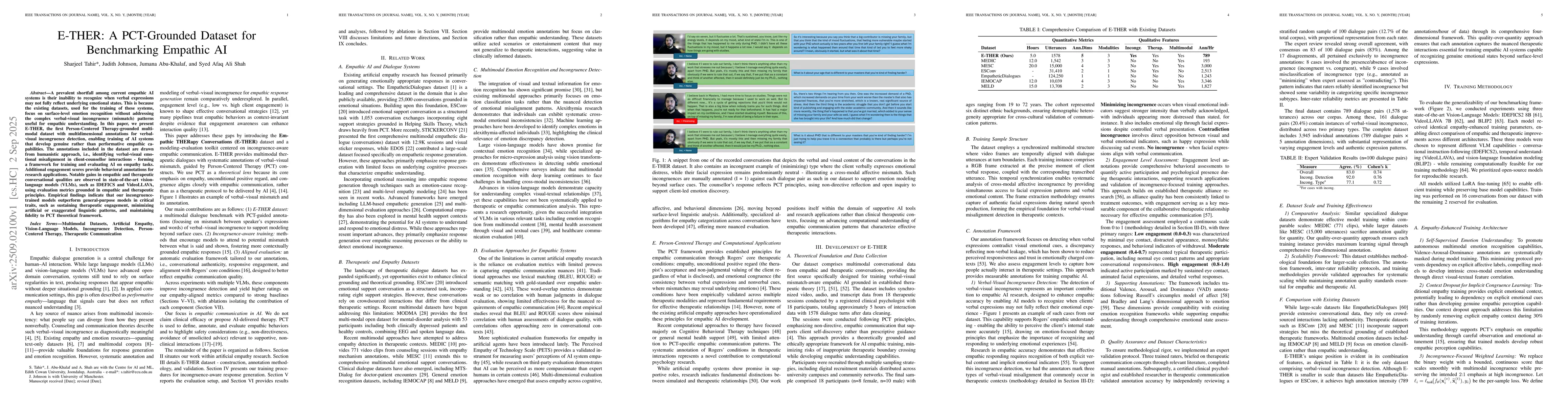 A prevalent shortfall among current empathic AI systems is their inability to recognize when verbal expressions may not fully reflect underlying emotional states. This is because the existing datasets, used for the training of these systems, focus on surface-level emotion recognition without addressing the complex verbal-visual incongruence (mismatch) patterns useful for empathic understanding. In this paper, we present E-THER, the first Person-Centered Therapy-grounded multimodal dataset with multidimensional annotations for verbal-visual incongruence detection, enabling training of AI systems that develop genuine rather than performative empathic capabilities. The annotations included in the dataset are drawn from humanistic approach, i.e., identifying verbal-visual emotional misalignment in client-counsellor interactions - forming a framework for training and evaluating AI on empathy tasks. Additional engagement scores provide behavioral annotations for research applications. Notable gains in empathic and therapeutic conversational qualities are observed in state-of-the-art vision-language models (VLMs), such as IDEFICS and VideoLLAVA, using evaluation metrics grounded in empathic and therapeutic principles. Empirical findings indicate that our incongruence-trained models outperform general-purpose models in critical traits, such as sustaining therapeutic engagement, minimizing artificial or exaggerated linguistic patterns, and maintaining fidelity to PCT theoretical framework.