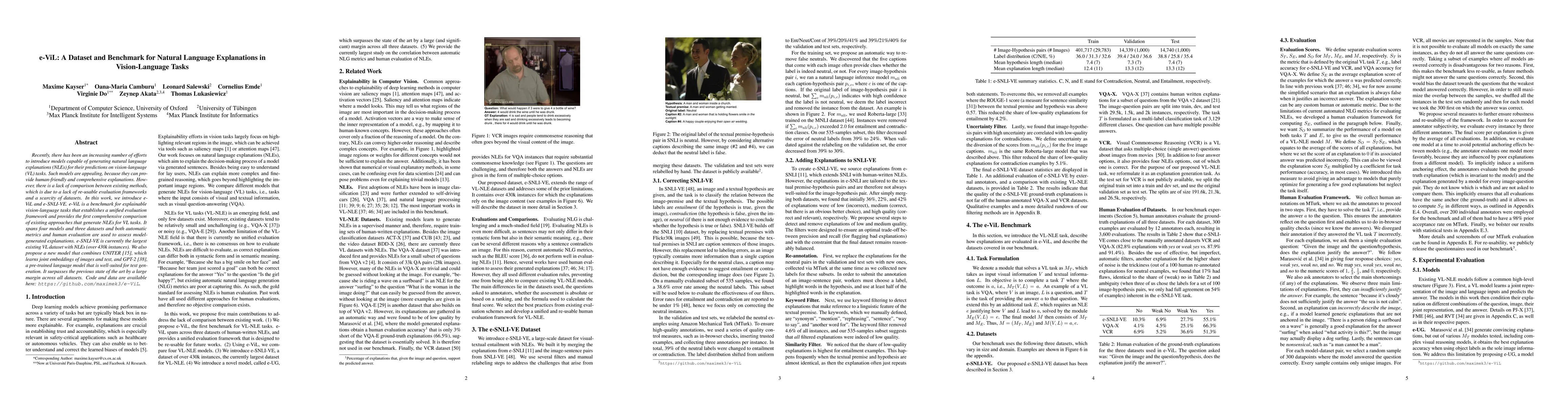 This paper introduces e-ViL, a benchmark for natural language explanations in vision-language tasks, featuring a unified evaluation framework and comparison of existing methods. It also presents e-SNLI-VE, the largest existing VL dataset with over 430k instances of NLEs, and proposes a new model combining UNITER and GPT-2, outperforming previous methods significantly.