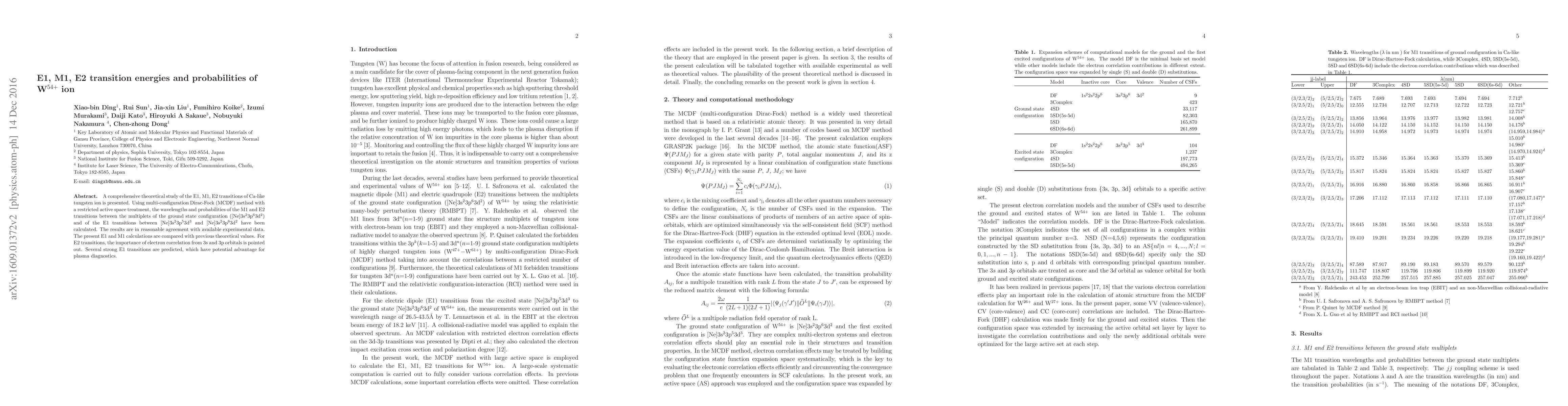 This paper presents a theoretical study using the multi-configuration Dirac-Fock method to calculate transition energies and probabilities for E1, M1, and E2 transitions in Ca-like tungsten ions. The study highlights the significance of electron correlation for E2 transitions and predicts several strong E1 transitions useful for plasma diagnostics.