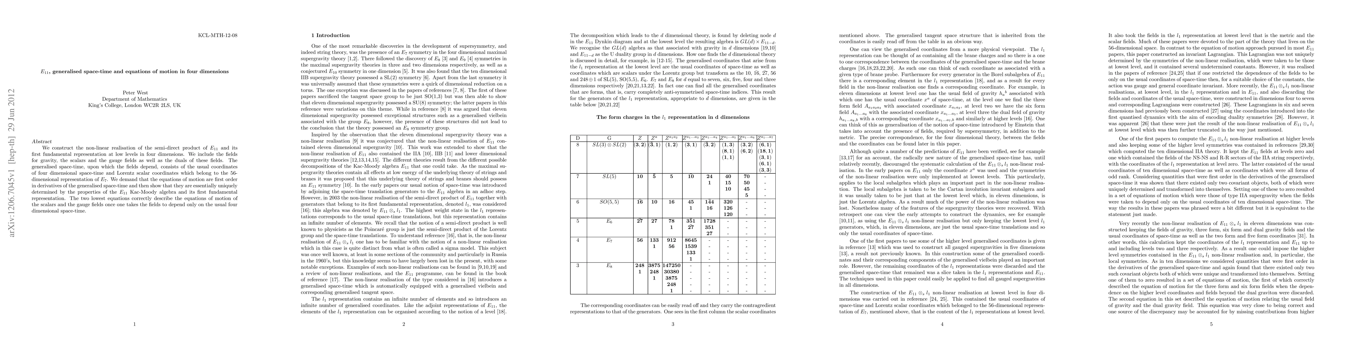 We construct the non-linear realisation of the semi-direct product of E11 and its first fundamental representation at low levels in four dimensions. We include the fields for gravity, the scalars and the gauge fields as well as the duals of these fields. The generalised space-time, upon which the fields depend, consists of the usual coordinates of four dimensional space-time and Lorentz scalar coordinates which belong to the 56-dimensional representation of E7. We demand that the equations of motion are first order in derivatives of the generalised space-time and then show that they are essentially uniquely determined by the properties of the E11 Kac-Moody algebra and its first fundamental representation. The two lowest equations correctly describe the equations of motion of the scalars and the gauge fields once one takes the fields to depend only on the usual four dimensional space-time.