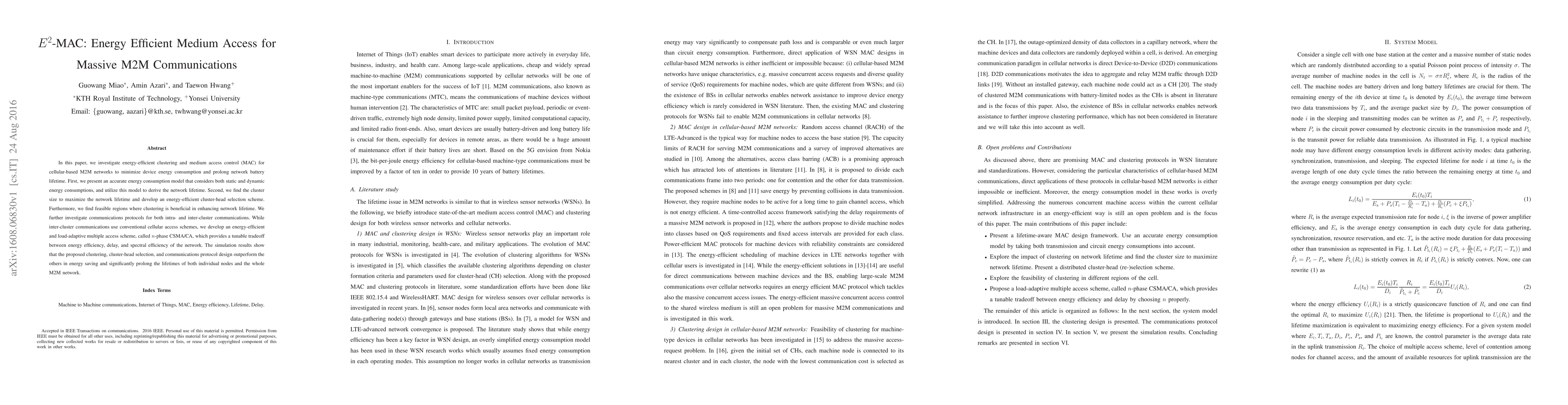 The research introduces a comprehensive energy-efficient MAC design for M2M communications, including clustering, cluster-head selection, and tunable n-phase CSMA/CA protocol, which outperform existing methods in terms of energy saving and network lifetime prolongation.