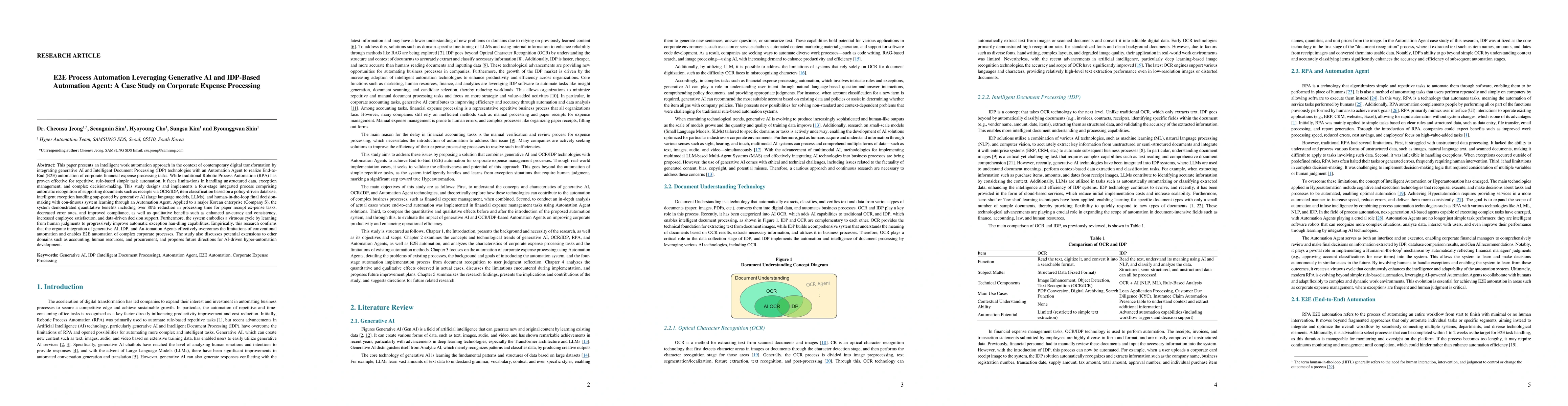 This research confirms that the integration of generative AI, IDP, and Automation Agents effectively overcomes the limitations of conventional automation, enabling E2E automation of complex corporate processes, with potential extensions to accounting, human resources, and procurement domains.