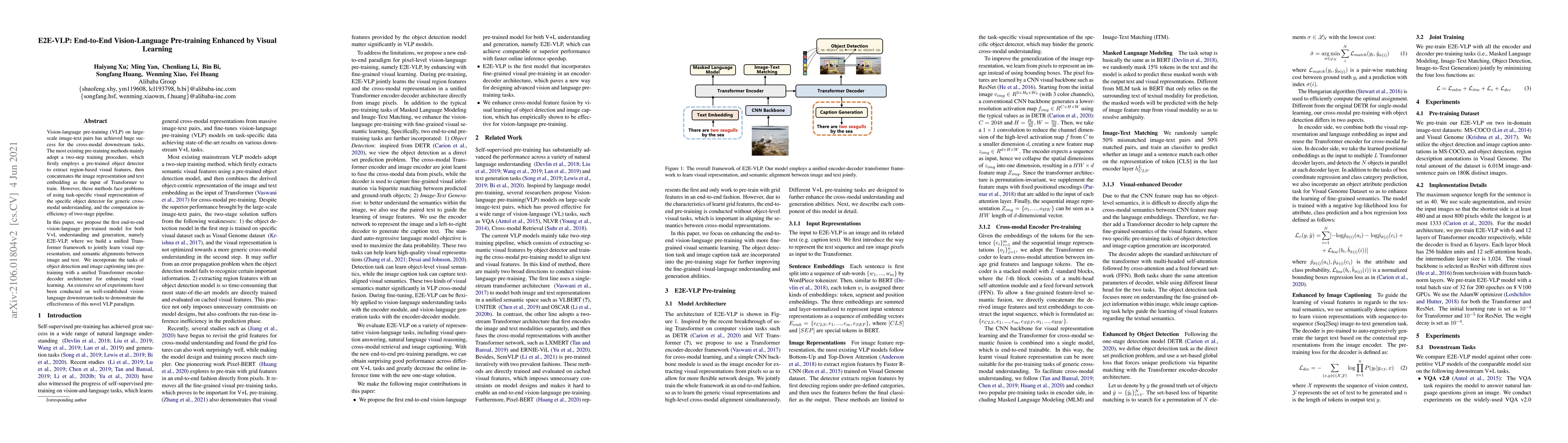 This paper introduces E2E-VLP, an end-to-end vision-language pre-training model that uses a unified Transformer framework to jointly learn visual representations and semantic alignments between images and text. It aims to address the inefficiencies and limitations of existing two-step pre-training methods by incorporating object detection and image captioning tasks within a single model, demonstrating improved performance on vision-language tasks.
