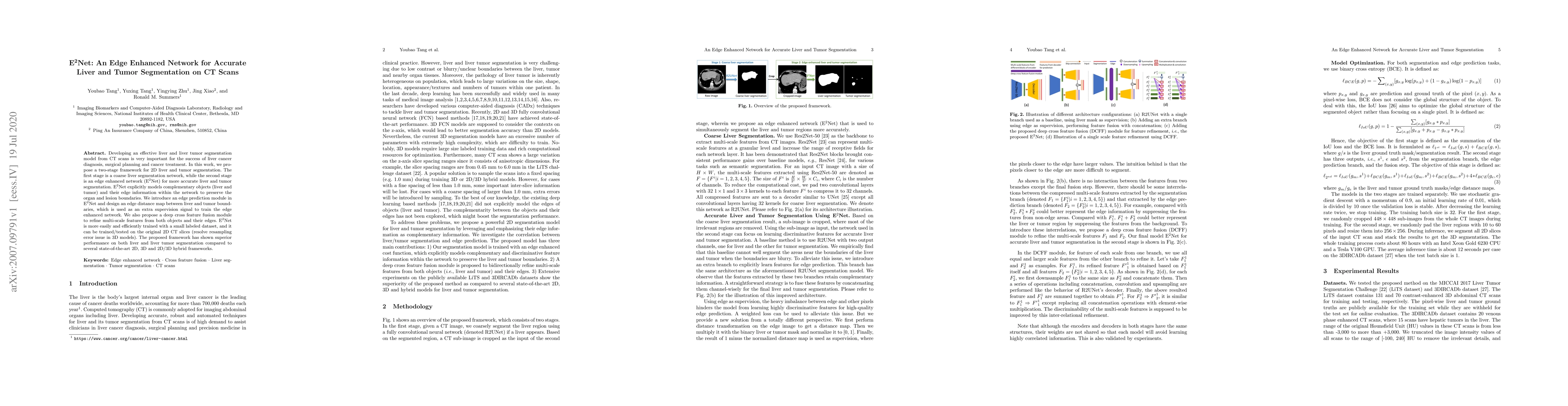 The paper proposes a two-stage framework for liver and tumor segmentation in CT scans, featuring a coarse liver segmentation network followed by an edge-enhanced network (E$^2$Net) that models liver and tumor edges to improve boundary accuracy. The framework demonstrates superior performance compared to other 2D, 3D, and hybrid segmentation methods.