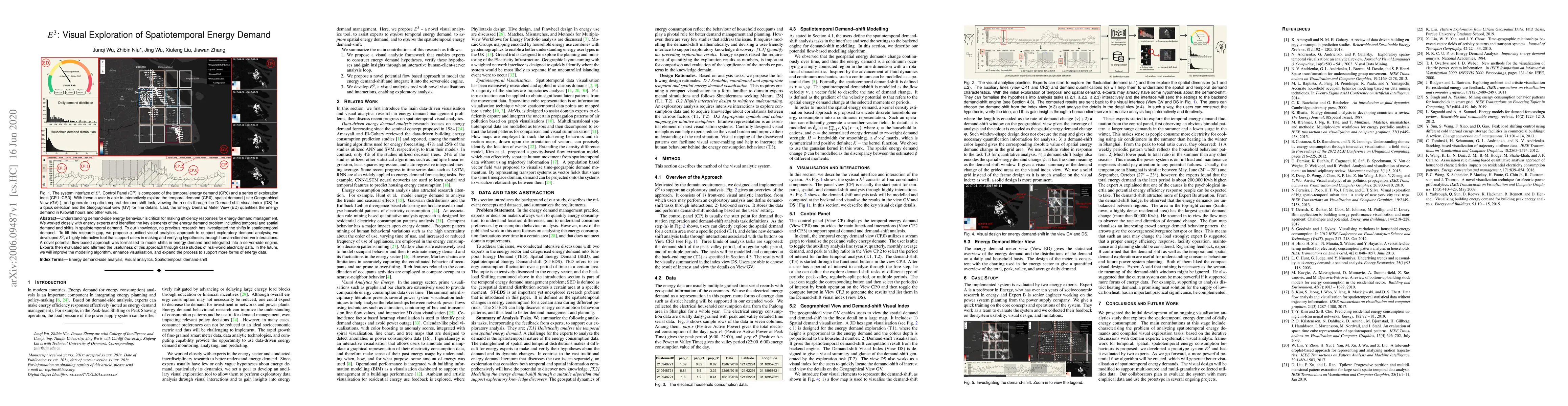 Understanding demand-side energy behaviour is critical for making efficiency responses for energy demand management. We worked closely with energy experts and identified the key elements of the energy demand problem including temporal and spatial demand and shifts in spatiotemporal demand. To our knowledge, no previous research has investigated the shifts in spatiotemporal demand. To fill this research gap, we propose a unified visual analytics approach to support exploratory demand analysis; we developed E3, a highly interactive tool that support users in making and verifying hypotheses through human-client-server interactions. A novel potential flow based approach was formalized to model shifts in energy demand and integrated into a server-side engine. Experts then evaluated and affirmed the usefulness of this approach through case studies of real-world electricity data. In the future, we will improve the modelling algorithm, enhance visualisation, and expand the process to support more forms of energy data.