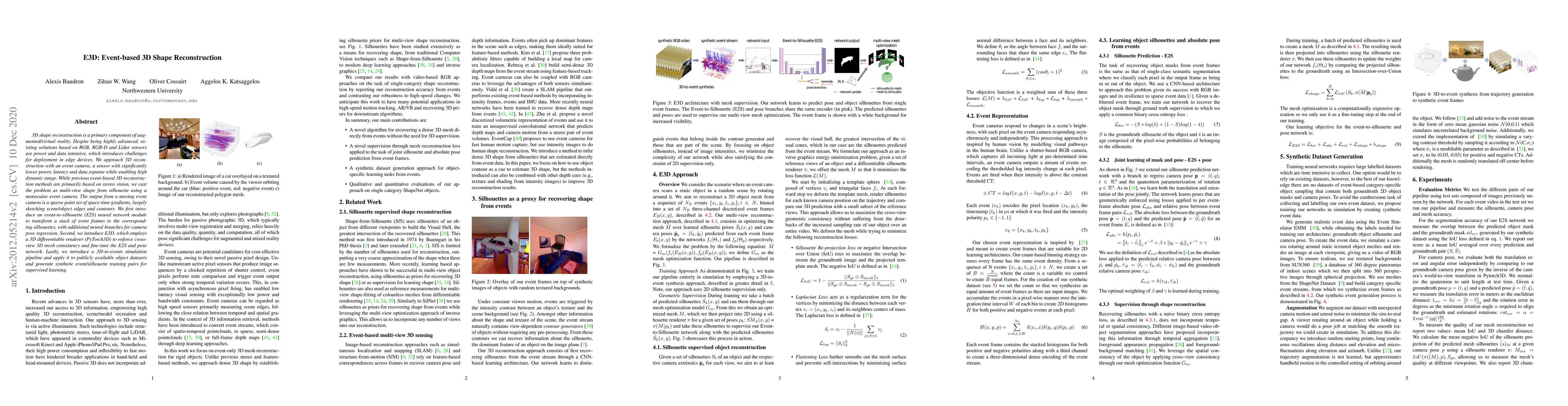 This paper proposes E3D, a method for 3D shape reconstruction using an event camera, which is more power-efficient than traditional RGB, RGB-D, and Lidar sensors. It introduces an event-to-silhouette neural network and a 3D differentiable renderer to enforce mesh consistency, enabling effective 3D reconstruction from sparse space-time gradients.