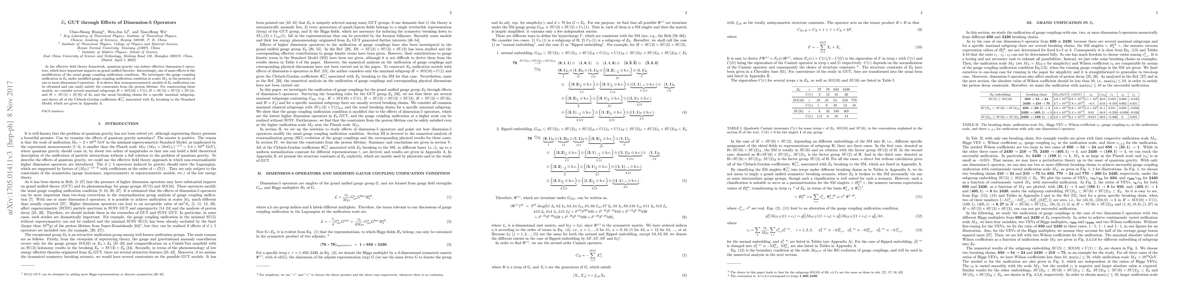 In the effective field theory framework, quantum gravity can induce effective dimension-5 operators, which have important impacts on grand unified theories. Interestingly, one of main effects is the modification of the usual gauge coupling unification condition. We investigate the gauge coupling unification in $E_{6}$ under modified gauge coupling unification condition at scales $M_X$ in the presence of one or more dimension-5 operators. It is shown that nonsupersymmetric models of $E_6$ unification can be obtained and can easily satisfy the constraints from the proton lifetime. For constructing these models, we consider several maximal subgroups $H=SO(10)\times U(1), H=SU(3)\times SU(3)\times SU(3)$, and $H=SU(2)\times SU(6)$ of $E_{6}$ and the usual breaking chains for a specific maximal subgroup, and derive all of the Clebsch-Gordan coefficients $\Phi^{(r)}_{s,z}$ associated with $E_6$ breaking to the Standard Model, which are given in Appendix A.