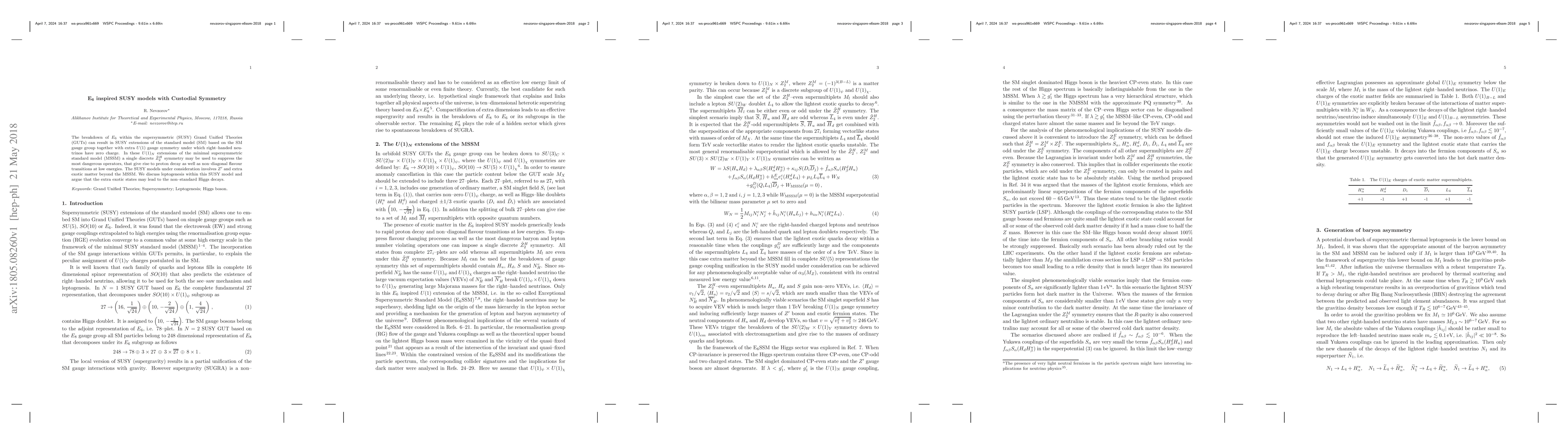 This paper explores E6-inspired SUSY models that incorporate a custodial symmetry, focusing on the breakdown of E6 within Grand Unified Theories to extend the Standard Model with extra U(1) gauge symmetry. The study discusses the suppression of proton decay and flavor transitions via a discrete symmetry and examines leptogenesis and non-standard Higgs decays in the context of these extended SUSY models.