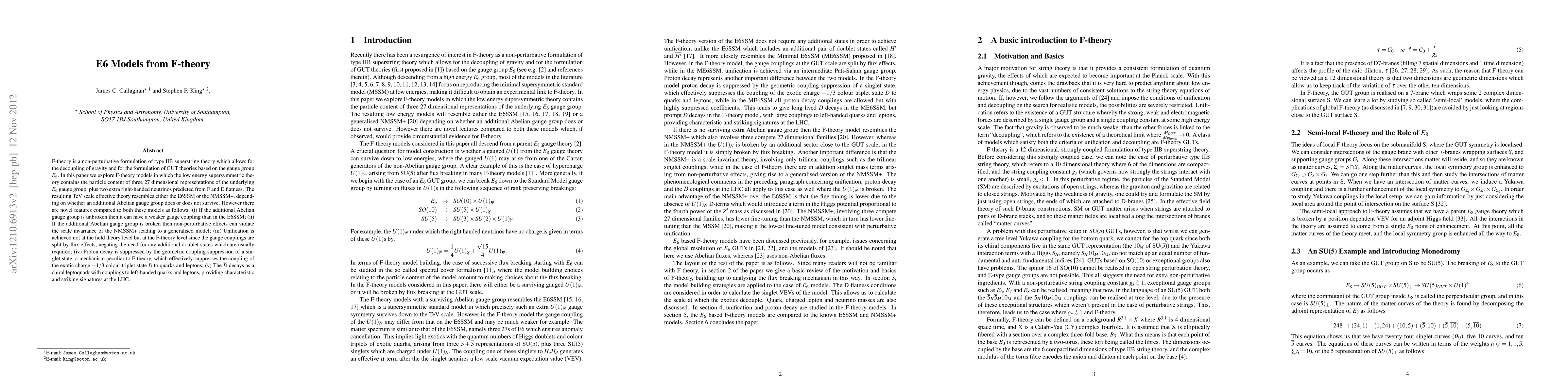 F-theory is a non-perturbative formulation of type IIB superstring theory which allows for the decoupling of gravity and for the formulation of GUT theories based on the gauge group E6. In this paper we explore F-theory models in which the low energy supersymmetric theory contains the particle content of three 27 dimensional representations of the underlying E6 gauge group, plus two extra right-handed neutrinos predicted from F and D flatness. The resulting TeV scale effective theory resembles either the E6SSM or the NMSSM+, depending on whether an additional Abelian gauge group does or does not survive. However there are novel features compared to both these models as follows: (i) If the additional Abelian gauge group is unbroken then it can have a weaker gauge coupling than in the E6SSM; (ii) If the additional Abelian gauge group is broken then non-perturbative effects can violate the scale invariance of the NMSSM+ leading to a generalised model; (iii) Unification is achieved not at the field theory level but at the F-theory level since the gauge couplings are split by flux effects, negating the need for any additional doublet states which are usually required; (iv) Proton decay is suppressed by the geometric coupling suppression of a singlet state, a mechanism peculiar to F-theory, which effectively suppresses the coupling of the exotic charge -1/3 colour triplet state D to quarks and leptons; (v) The D bar couples to left-handed leptoquarks, providing characteristic and striking signatures at the LHC.