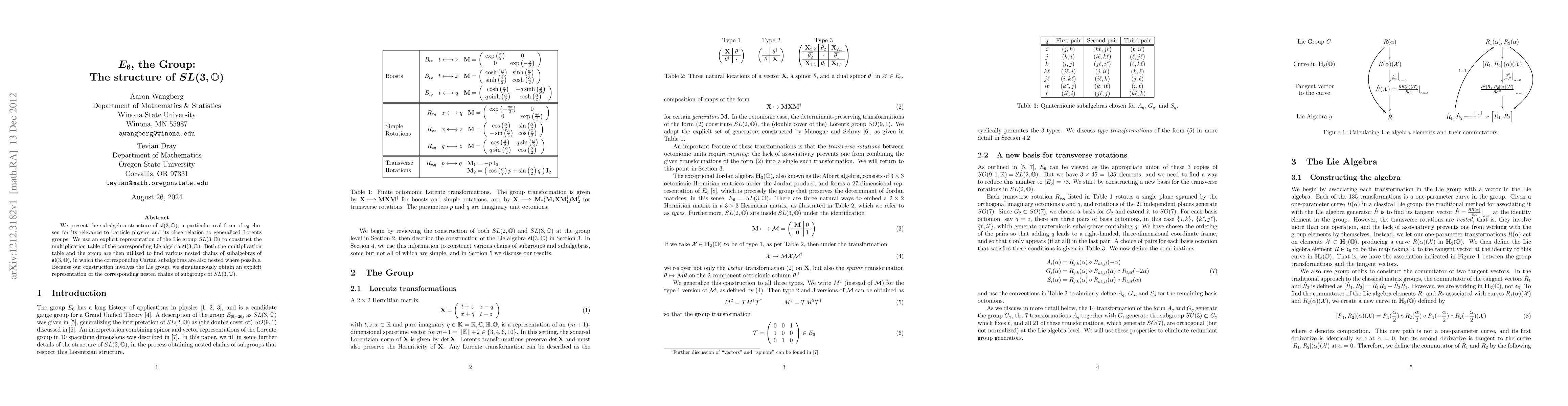 This paper explores the subalgebra structure of sl(3,O), a real form of e6, using an explicit representation of the Lie group SL(3,O). It constructs the multiplication table for sl(3,O) and identifies nested chains of subalgebras, alongside corresponding nested Cartan subalgebras and subgroups of SL(3,O).