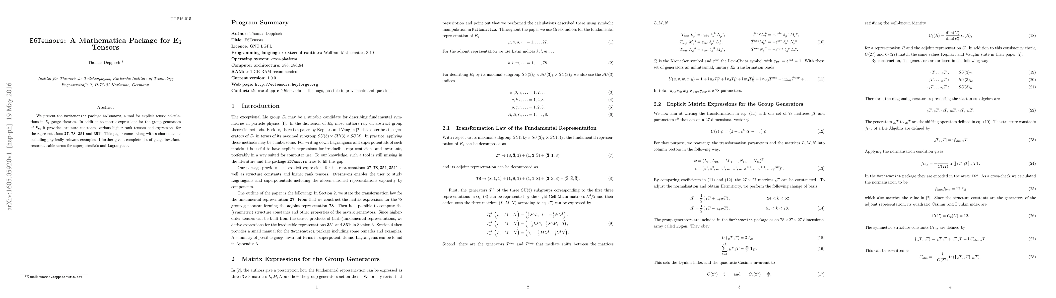 The Mathematica package E6Tensors facilitates explicit tensor calculations in E6 gauge theories, offering matrix expressions, structure constants, and higher-rank tensors for representations 27, 78, 351, and 351'. It also includes a manual with examples and a list of gauge invariant, renormalizable terms for superpotentials and Lagrangians.