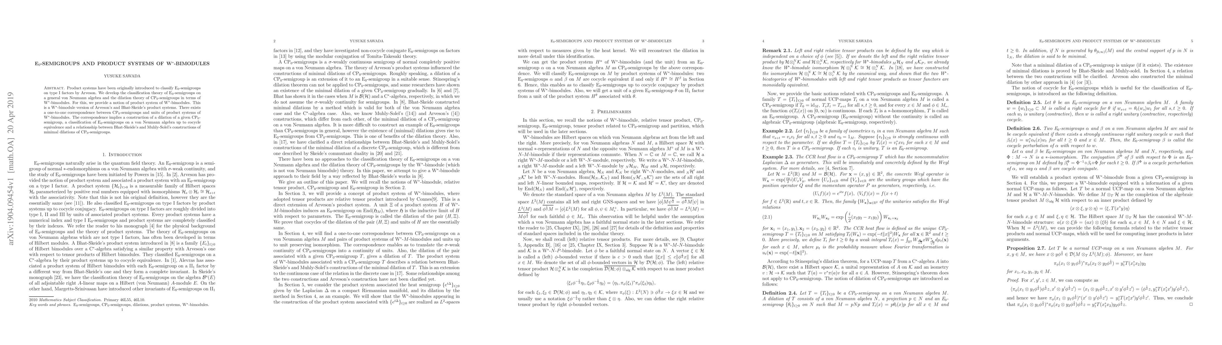 This paper develops the classification theory of E$_0$-semigroups on von Neumann algebras and introduces product systems of W$^*$-bimodules, establishing a one-to-one correspondence between CP$_0$-semigroups and units of these bimodules, which leads to dilation constructions and classifications.