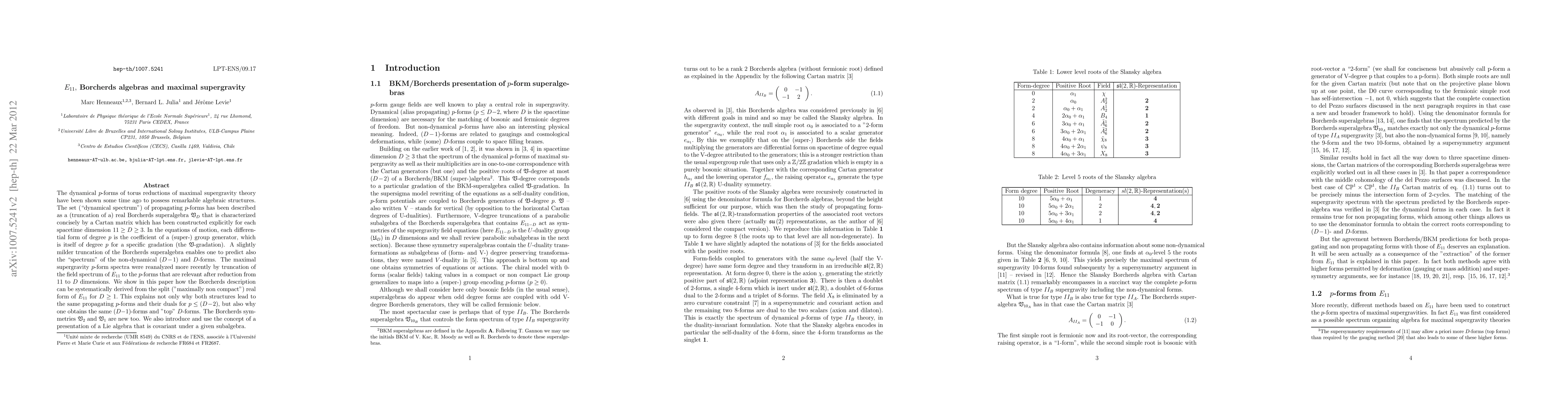 The dynamical $p$-forms of torus reductions of maximal supergravity theory have been shown some time ago to possess remarkable algebraic structures. The set ("dynamical spectrum") of propagating $p$-forms has been described as a (truncation of a) real Borcherds superalgebra $\mf{V}_D$ that is characterized concisely by a Cartan matrix which has been constructed explicitly for each spacetime dimension $11 \geq D \geq 3.$ In the equations of motion, each differential form of degree $p$ is the coefficient of a (super-) group generator, which is itself of degree $p$ for a specific gradation (the $\mf{V}$-gradation). A slightly milder truncation of the Borcherds superalgebra enables one to predict also the "spectrum" of the non-dynamical $(D - 1)$ and $D$-forms. The maximal supergravity $p$-form spectra were reanalyzed more recently by truncation of the field spectrum of $E_{11}$ to the $p$-forms that are relevant after reduction from 11 to $D$ dimensions. We show in this paper how the Borcherds description can be systematically derived from the split ("maximally non compact") real form of $E_{11}$ for $D \geq 1.$ This explains not only why both structures lead to the same propagating $p$-forms and their duals for $p\leq (D - 2),$ but also why one obtains the same $(D - 1)$-forms and "top" $D$-forms. The Borcherds symmetries $\mf{V}_2$ and $\mf{V}_1$ are new too. We also introduce and use the concept of a presentation of a Lie algebra that is covariant under a given subalgebra.