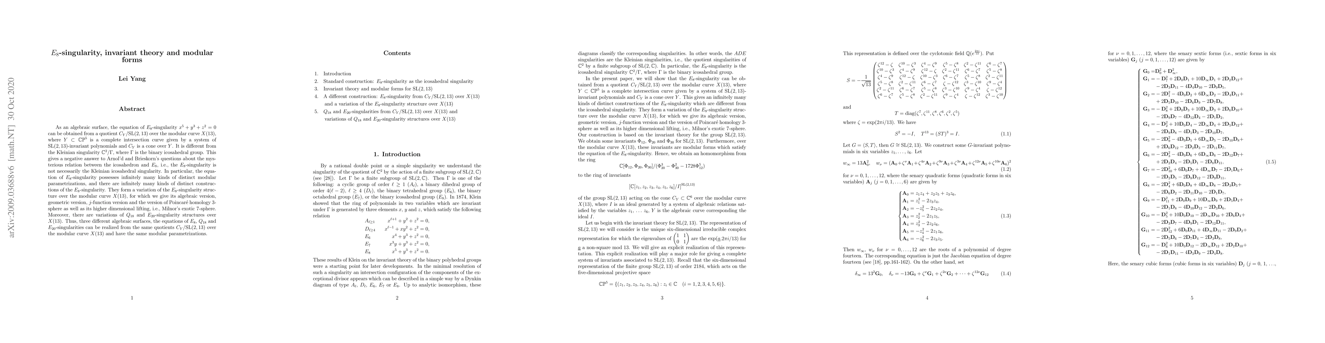As an algebraic surface, the equation of $E_8$-singularity $x^5+y^3+z^2=0$ can be obtained from a quotient $C_Y/\text{SL}(2, 13)$ over the modular curve $X(13)$, where $Y \subset \mathbb{CP}^5$ is a complete intersection curve given by a system of $\text{SL}(2, 13)$-invariant polynomials and $C_Y$ is a cone over $Y$. It is different from the Kleinian singularity $\mathbb{C}^2/\Gamma$, where $\Gamma$ is the binary icosahedral group. This gives a negative answer to Arnol'd and Brieskorn's questions about the mysterious relation between the icosahedron and $E_8$, i.e., the $E_8$-singularity is not necessarily the Kleinian icosahedral singularity. In particular, the equation of $E_8$-singularity possesses infinitely many kinds of distinct modular parametrizations, and there are infinitely many kinds of distinct constructions of the $E_8$-singularity. They form a variation of the $E_8$-singularity structure over the modular curve $X(13)$, for which we give its algebraic version, geometric version, $j$-function version and the version of Poincar\'{e} homology $3$-sphere as well as its higher dimensional lifting, i.e., Milnor's exotic $7$-sphere. Moreover, there are variations of $Q_{18}$ and $E_{20}$-singularity structures over $X(13)$. Thus, three different algebraic surfaces, the equations of $E_8$, $Q_{18}$ and $E_{20}$-singularities can be realized from the same quotients $C_Y/\text{SL}(2, 13)$ over the modular curve $X(13)$ and have the same modular parametrizations.