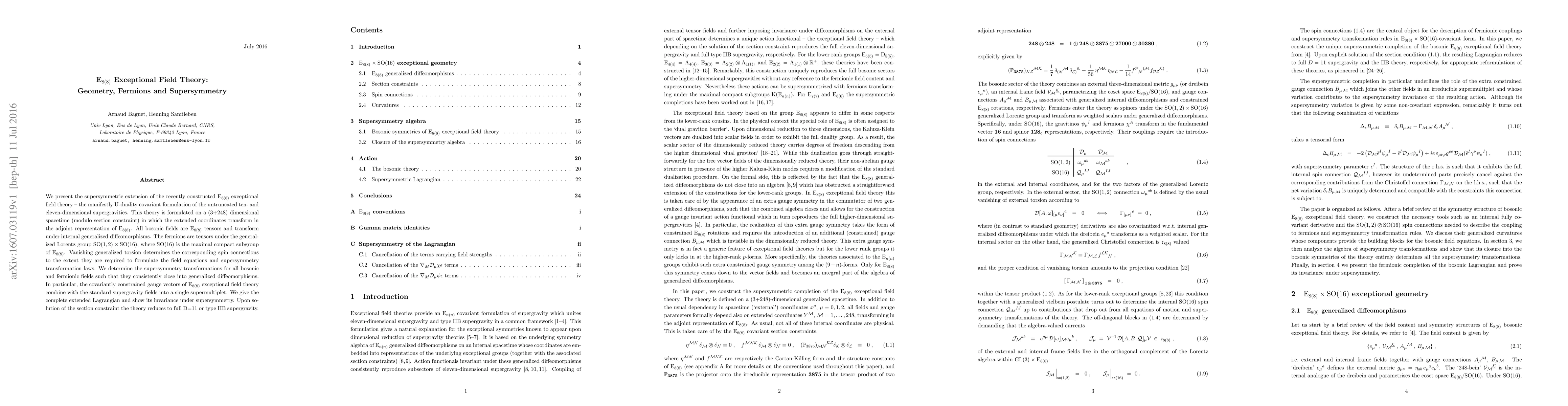 We present the supersymmetric extension of the recently constructed E$_{8(8)}$ exceptional field theory -- the manifestly U-duality covariant formulation of the untruncated ten- and eleven-dimensional supergravities. This theory is formulated on a (3+248) dimensional spacetime (modulo section constraint) in which the extended coordinates transform in the adjoint representation of E$_{8(8)}$. All bosonic fields are E$_{8(8)}$ tensors and transform under internal generalized diffeomorphisms. The fermions are tensors under the generalized Lorentz group SO(1,2)$\times$SO(16), where SO(16) is the maximal compact subgroup of E$_{8(8)}$. Vanishing generalized torsion determines the corresponding spin connections to the extent they are required to formulate the field equations and supersymmetry transformation laws. We determine the supersymmetry transformations for all bosonic and fermionic fields such that they consistently close into generalized diffeomorphisms. In particular, the covariantly constrained gauge vectors of E$_{8(8)}$ exceptional field theory combine with the standard supergravity fields into a single supermultiplet. We give the complete extended Lagrangian and show its invariance under supersymmetry. Upon solution of the section constraint the theory reduces to full D=11 or type IIB supergravity.