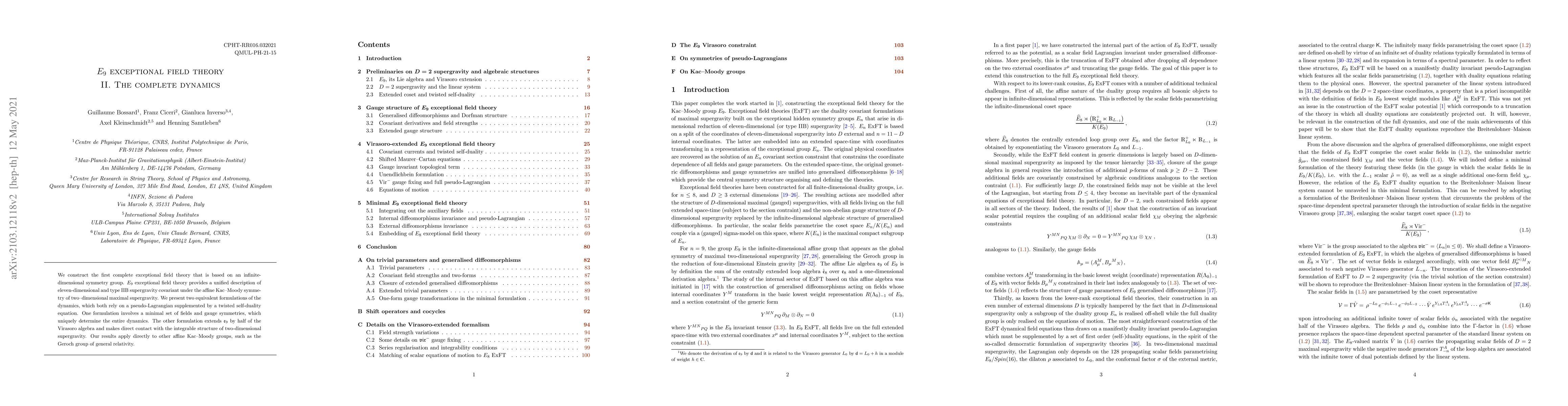 We construct the first complete exceptional field theory that is based on an infinite-dimensional symmetry group. E$_9$ exceptional field theory provides a unified description of eleven-dimensional and type IIB supergravity covariant under the affine Kac-Moody symmetry of two-dimensional maximal supergravity. We present two equivalent formulations of the dynamics, which both rely on a pseudo-Lagrangian supplemented by a twisted self-duality equation. One formulation involves a minimal set of fields and gauge symmetries, which uniquely determine the entire dynamics. The other formulation extends $\mathfrak{e}_9$ by half of the Virasoro algebra and makes direct contact with the integrable structure of two-dimensional supergravity. Our results apply directly to other affine Kac-Moody groups, such as the Geroch group of general relativity.
