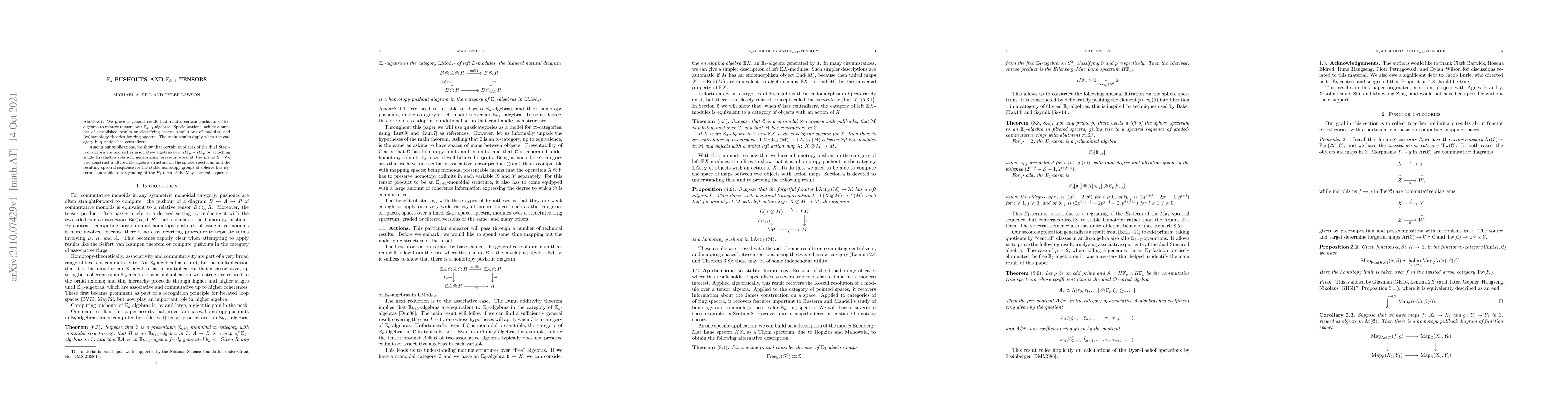 We prove a general result that relates certain pushouts of $E_k$-algebras to relative tensors over $E_{k+1}$-algebras. Specializations include a number of established results on classifying spaces, resolutions of modules, and (co)homology theories for ring spectra. The main results apply when the category in question has centralizers. Among our applications, we show that certain quotients of the dual Steenrod algebra are realized as associative algebras over $HF_p \wedge HF_p$ by attaching single $E_1$-algebra relation, generalizing previous work at the prime $2$. We also construct a filtered $E_2$-algebra structure on the sphere spectrum, and the resulting spectral sequence for the stable homotopy groups of spheres has $E_1$-term isomorphic to a regrading of the $E_1$-term of the May spectral sequence.